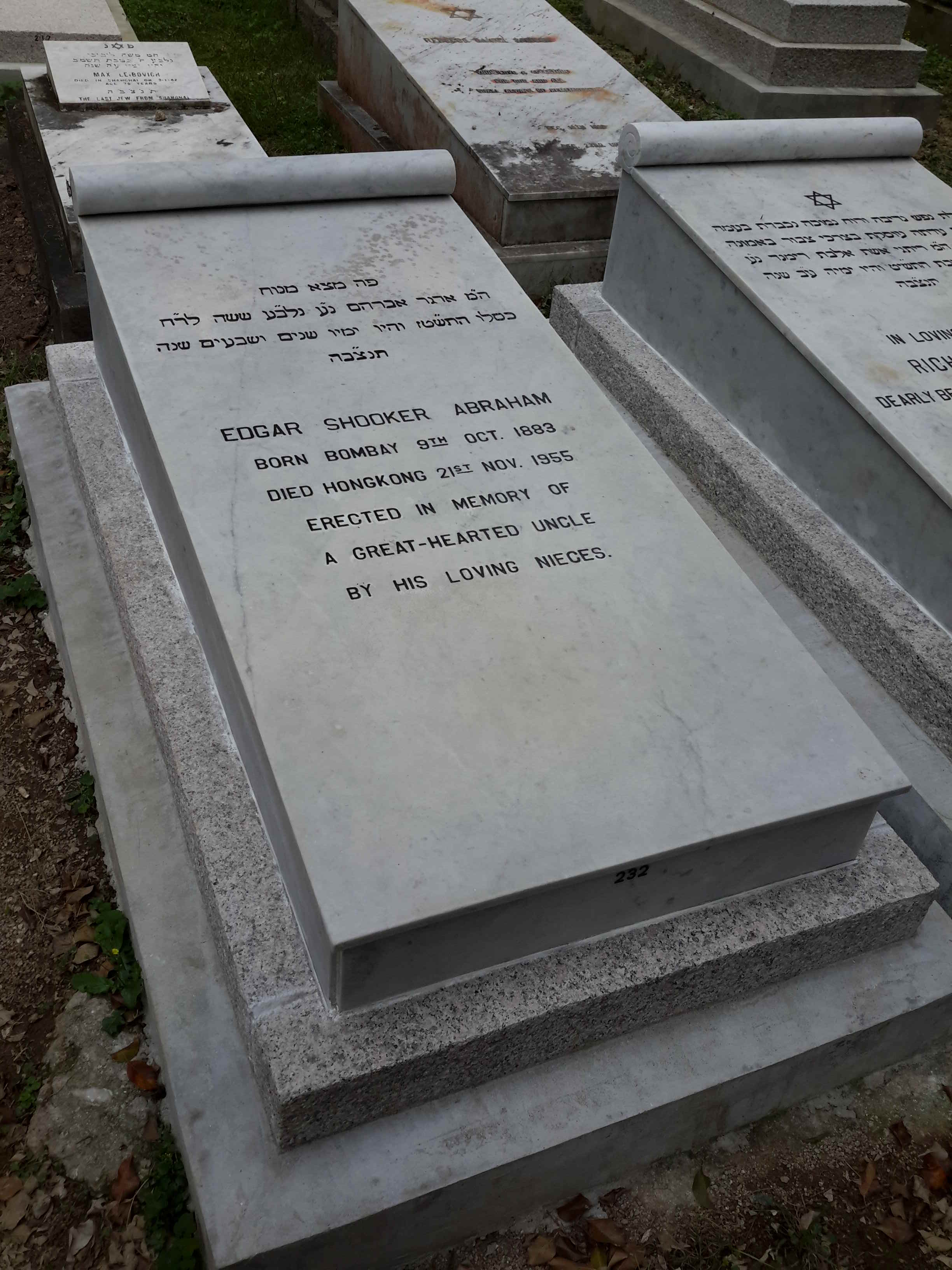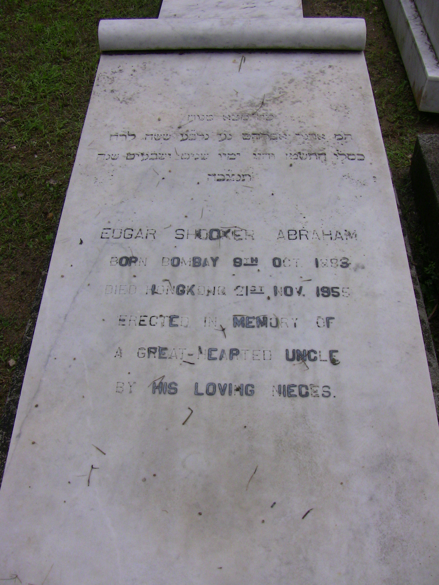 | Inscription (Eng) | EDGAR SHOOKER ABRAHAM BORN BOMBAY 9TH OCT. 1883 DIED HONG KONG 21ST NOV. 1955 ERECTED IN MEMORY OF A GREAT-HEARTED UNCLE BY HIS LOVING NIECES. |