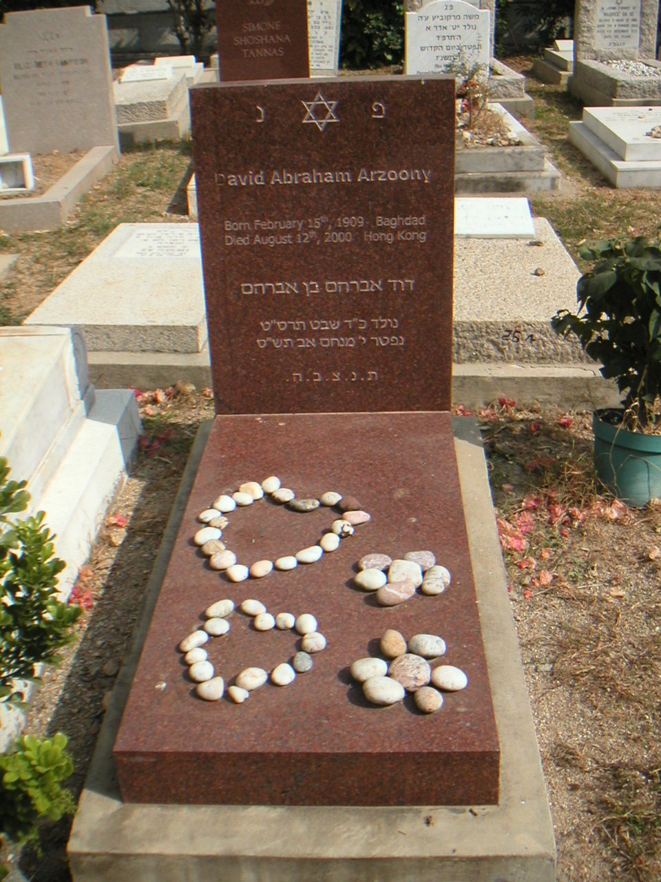 | Inscription (Eng) | David Abraham Arzoony Born February 15th, 1909 Baghdad Died August 12th, 2000 Hong Kong |