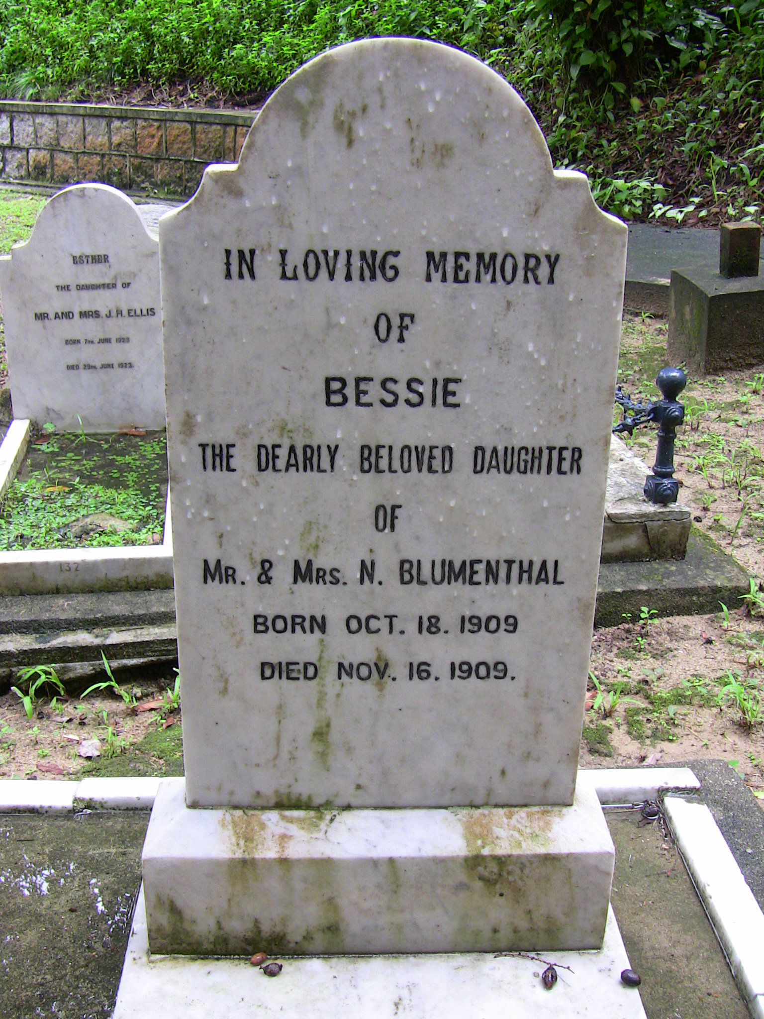 | Inscription (Eng) | IN LOVING MEMORY OF BESSIE THE DEARLY BELOVED DAUGHTER OF MR. & MRS. N. BLUMENTHAL BORN OCT. 18, 1909 DIED NOV. 16, 1909. |