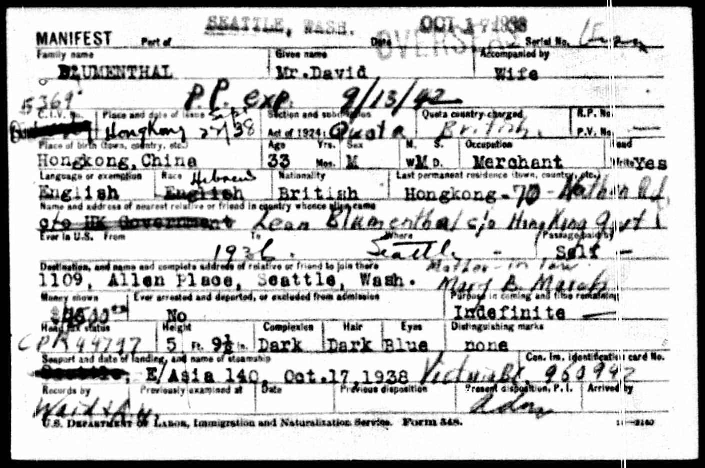 | Historical | According to a birth notice in the Hong Kong Telegraph (October 19, 1909), she was born at 9:15 pm at College Chambers. It was located at 9 Seymour Terrace. Nathan Blumenthal was the manager of the Astor House Hotel at 13 Queen’s Road Central. David married American Leona Elizabeth March Rees in Hong Kong on January 9, 1934. In 1936, he owned the Marcel Bakery and Confectionery, 70 Nathan Road, Kowloon. Leon Blumenthal joined the the Prisons Department on 15 Aug 1935 and retired in 1965 from the post of Senior Superintendent (which was the next highest rank under the charge of Commissioner at that time) to Australia. Cecilia married Hywel Owen Davies (son of the late Captain & Mrs. Edward John Davies of Caerphilly, South Wales) on March 14, 1933. Their mother had already passed away by that time. Billie married Arthur Boyd Henry in St. John’s Cathedral on October 17, 1935. She was a teacher and he was a journalist. Arthur was born in Kobe, Japan in 1907. During the war, he served as a corporal for the British forces and was captured by the Japanese in Singapore. After the war ended, he and Billie moved to Brisbane. They had four children (Janet, Katrina, Sandy and Nana). |