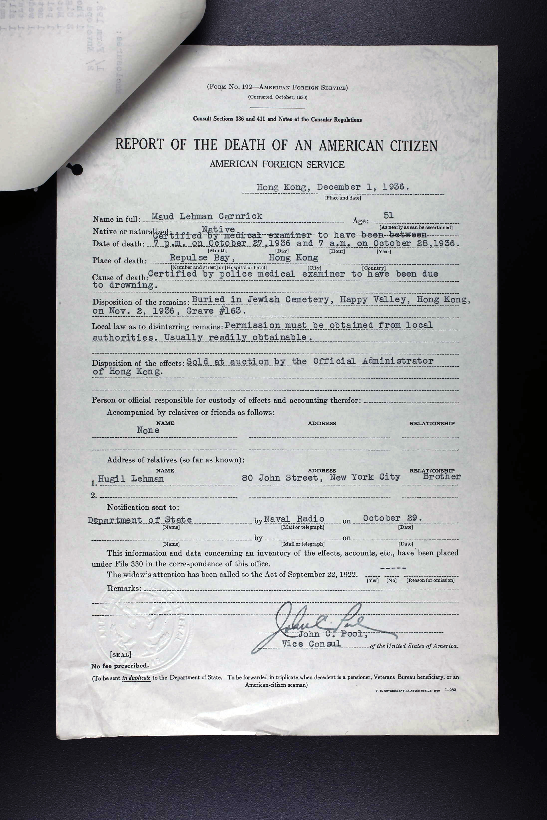 | Historical | This was Edgar’s third marriage. He was born in 1869. It appears that he and Maud had no children but he did have a son, also named Edgar Mortimer Carnrick, with his second wife. Edgar (Sr.) died in 1934 in Los Angeles. He is buried in Forest Lawn Memorial Park (Utility Columbarium, Lot 0, Space 523448) in Glendale, CA. Maud sailed on the Empress of Australia to New York in April 1935. The ship’s manifest lists her home address as 502 Park Avenue, NY, so when did she come to Hong Kong? A family story is that she often told them that she wanted to walk into the South China Sea and never come back. As she drowned in Repulse Bay, perhaps she came to HK to kill herself. |