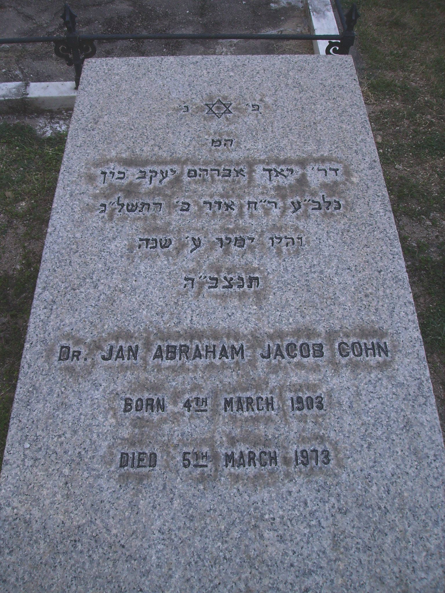 | Inscription (Eng) | DR. JAN ABRAHAM JACOB COHN BORN 4TH MARCH 1903 DIED 5TH MARCH 1973 |