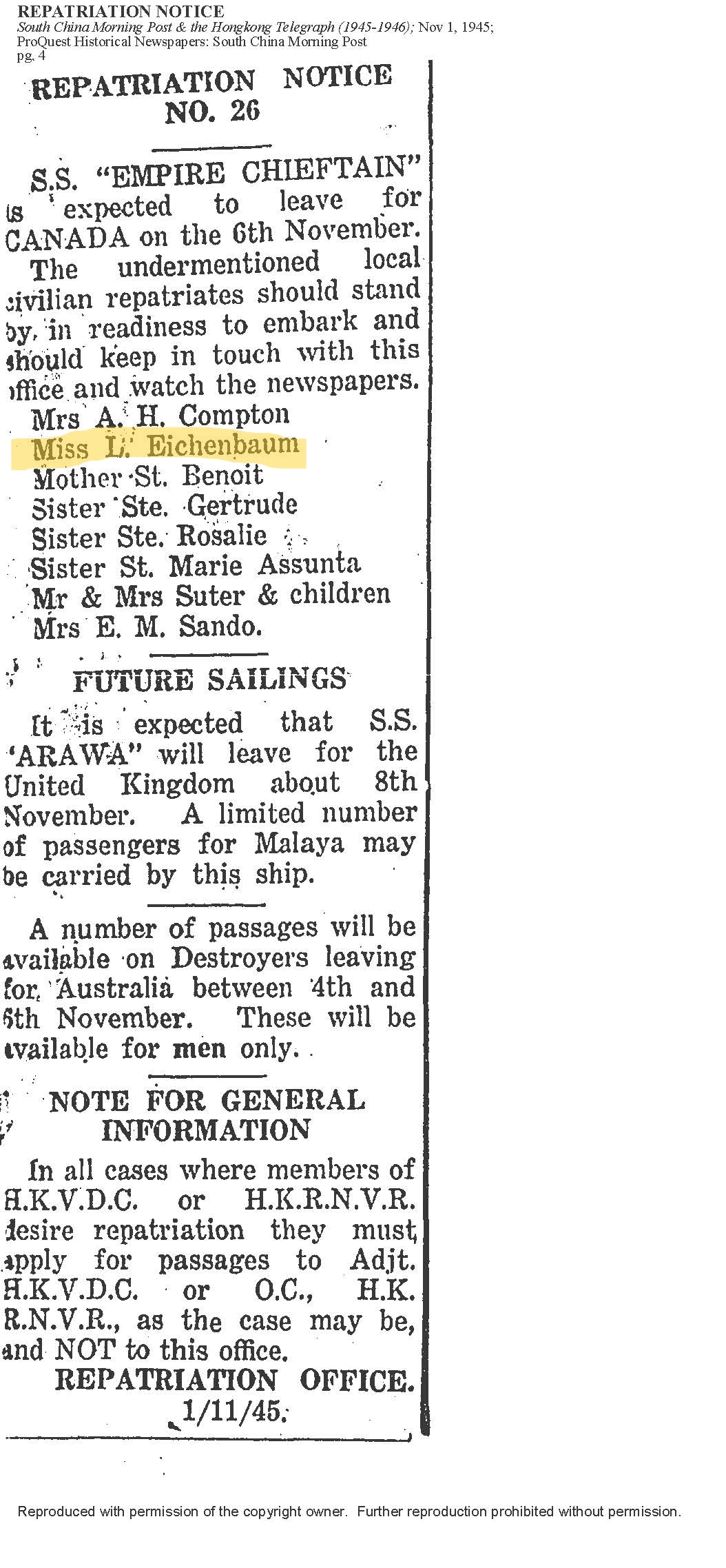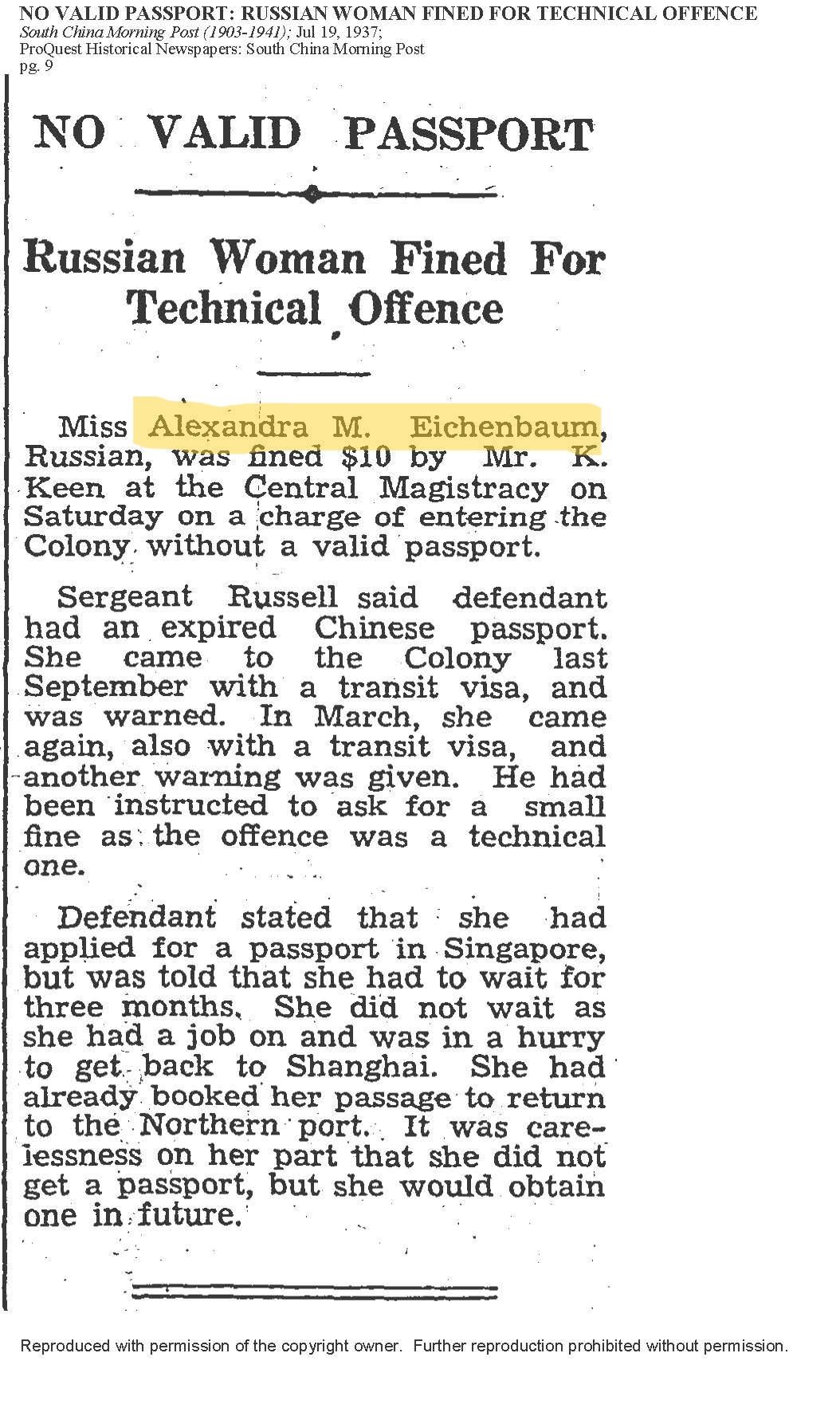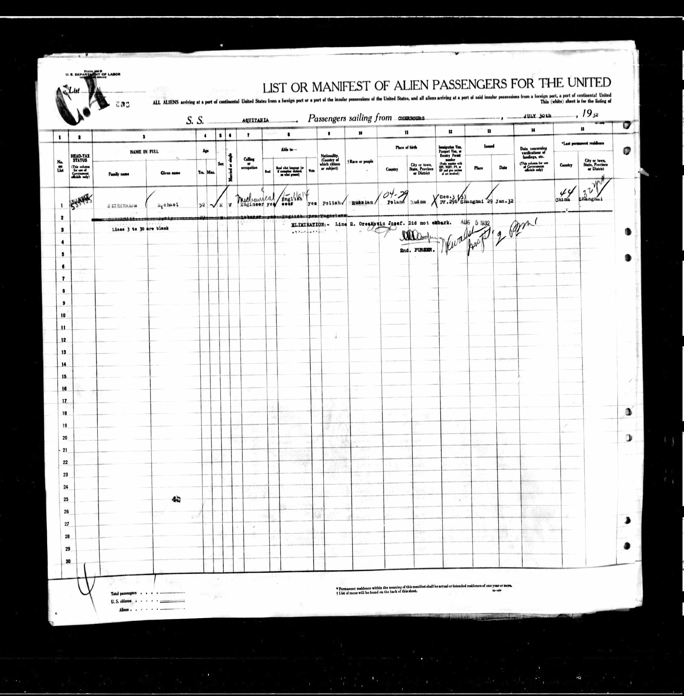 | Historical | He was a tobacconist. He had four daughters. The first, named Maria (b. November 6, 1897, Irkutsk; d. April 13, 1988, Honolulu), married Frank Bernard Baldwin in the Union Church (Presbyterian) in Shanghai on September 16, 1922. Frank was a physician (major rank) in the US army. The couple is buried in the National Memorial Cemetery of the Pacific, in Honolulu. The second daughter, Anna (b. February 17, 1904, Warsaw; d. February 17, 2002, Los Angeles), married Joseph George Vantchurin also in Shanghai on November 22, 1922. They later divorced and she moved to Beverly Hills, CA with their two daughters, Diana Geraldine and Nadine Sylvia, after the war. Joseph was a banker. The third, Alexandra (b. c. 1905, Warsaw; d. 1963, Los Angeles), was married to William Ernst Haarmann. The fourth, Lucille (Lucy) Dianna (b. August 26, 1914, Warsaw; d. May 1992, Poole), was a teacher. She married Albert Victor Currie, who was a government chartered surveyor. Lucille is mentioned in Jean Gittins’ memoir, “Stanley: Behind Barbed Wire” (page 163). A Boris Mikhailovich Eikhenbaum (1886–1959) was a Russian and Soviet literary scholar and historian of Russian literature. He was the grandson of Jewish mathematician and poet Jacob Eichenbaum. Was he a cousin? |