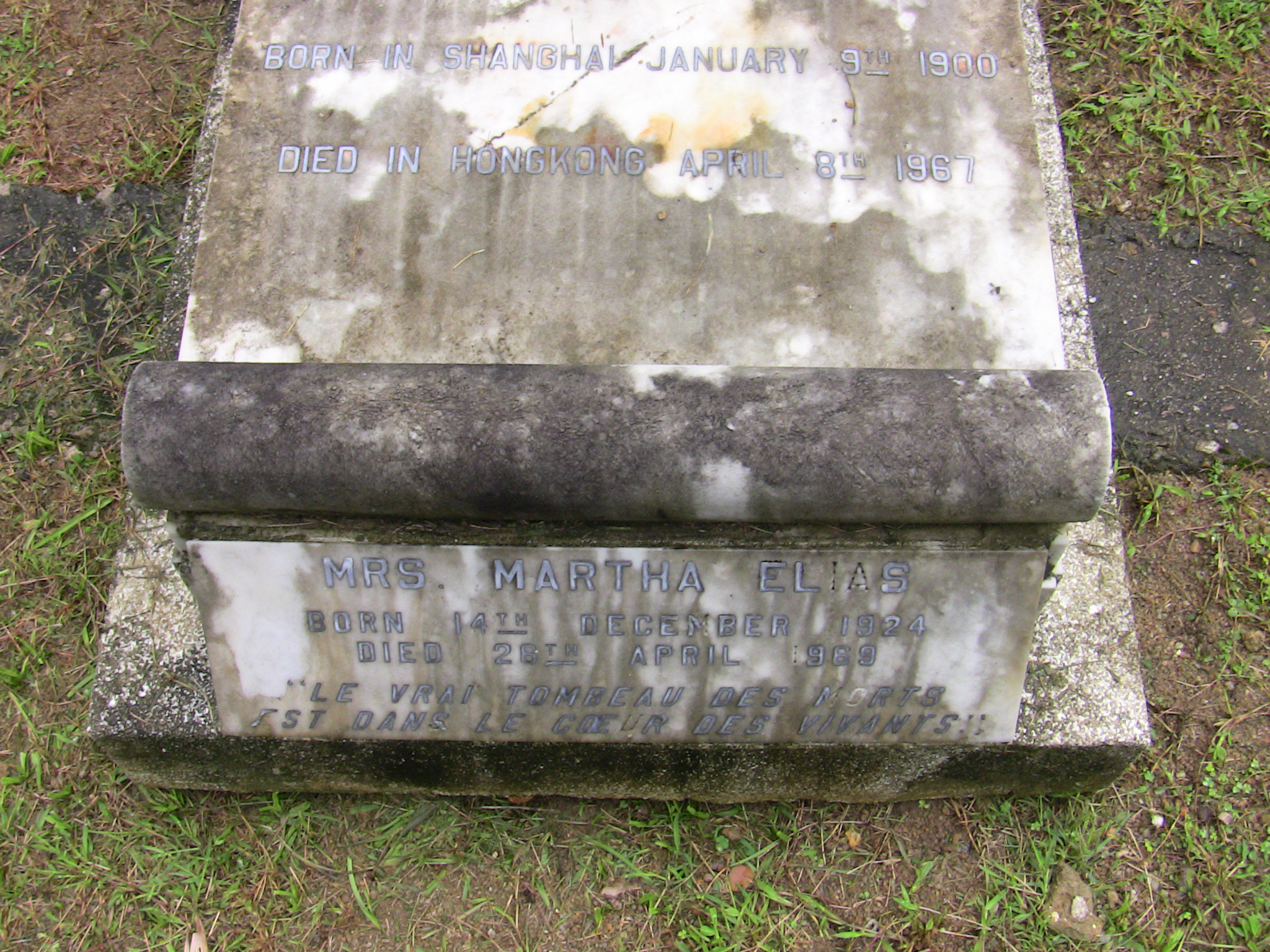 | Inscription (Eng) | (Main inscription): IN LOVING MEMORY OF EDWARD LEOPOLD ELIAS BORN IN SHANGHAI JANUARY 9TH 1900 DIED IN HONG KONG APRIL 8TH 1967 (Small plaque): MRS. MARTHA ELIAS BORN 14TH DECEMBER 1924 DIED 26TH APRIL 1969 “LE VRAI TOMBEAU DES MORTS EST DANS LE COEUR DES VIVANTS.” (Translation: “The real tomb of the dead is in the heart of the living.”) |