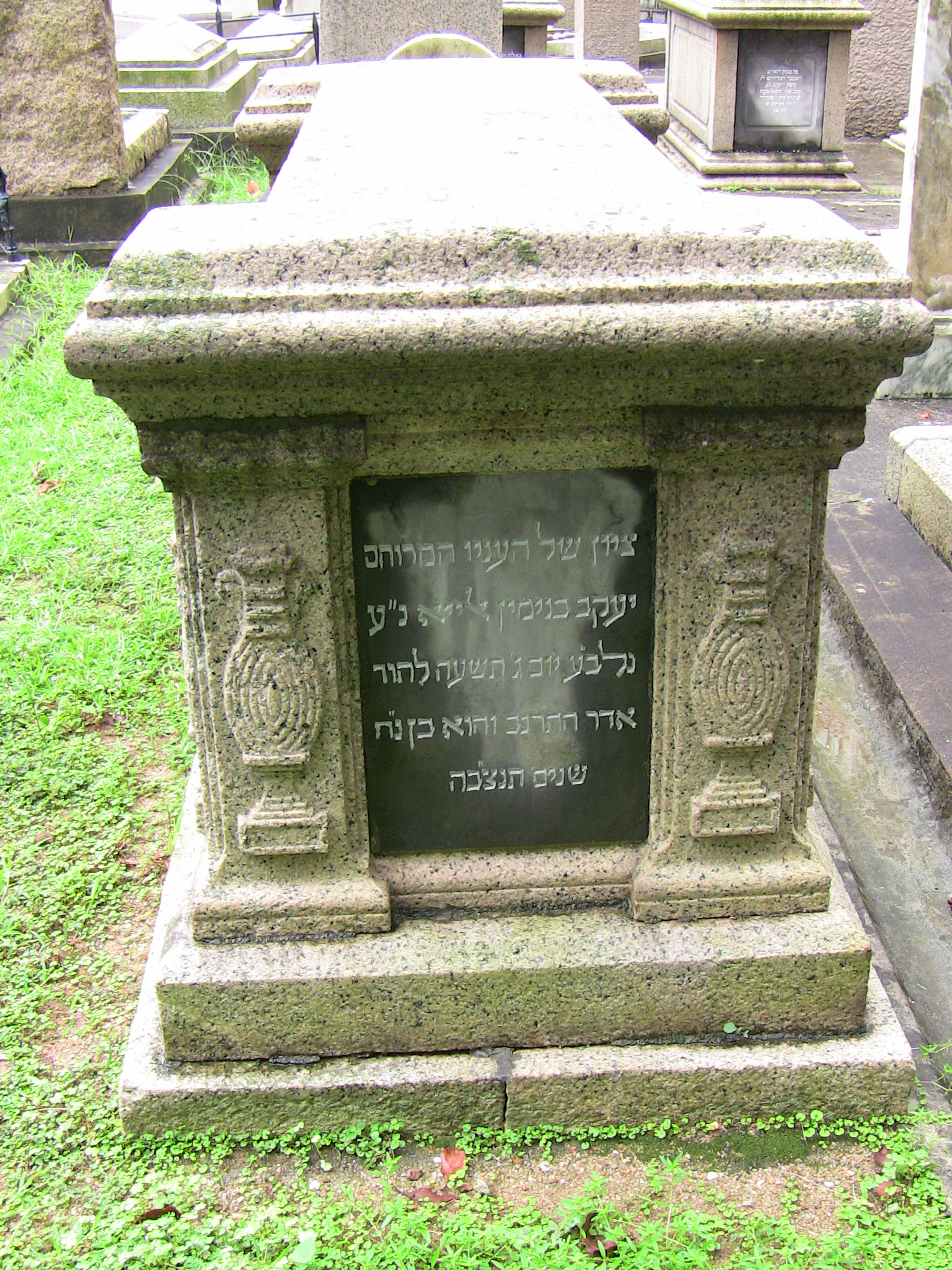 | Inscription (Eng) | SACRED TO THE MEMORY OF JACOB BENJAMIN ELIAS WHO DEPARTED THIS LIFE ON THE 9TH ADAR 5652 (8TH MARCH 1892) AGED 58 YEARS. MAY HIS SOUL REST IN PEACE |