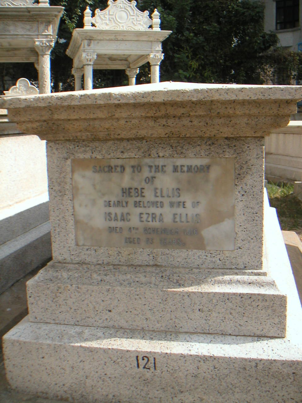 | Inscription (Eng) | SACRED TO THE MEMORY OF HEBE ELLIS DEARLY BELOVED WIFE OF ISAAC EZRA ELLIS DIED 4TH. NOVEMBER 1916 AGED 83 YEARS. |