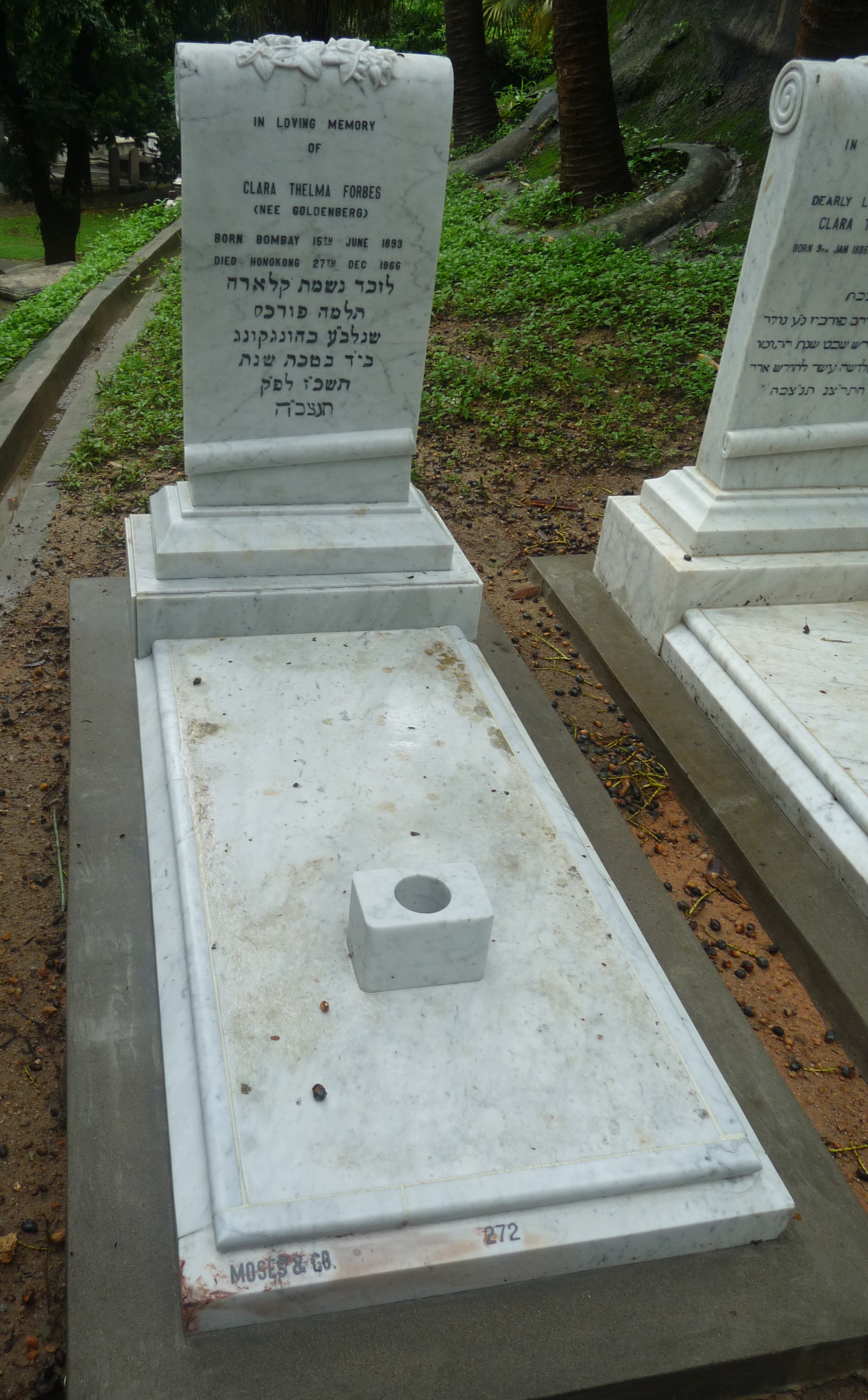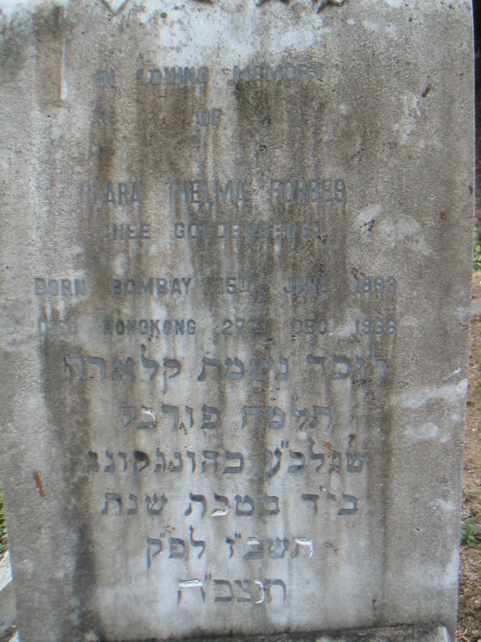 | Inscription (Eng) | IN LOVING MEMORY OF CLARA THELMA FORBES (NEE GOLDENBERG) BORN BOMBAY 15TH JUNE 1893 DIED HONG KONG 27TH DEC. 1966 |