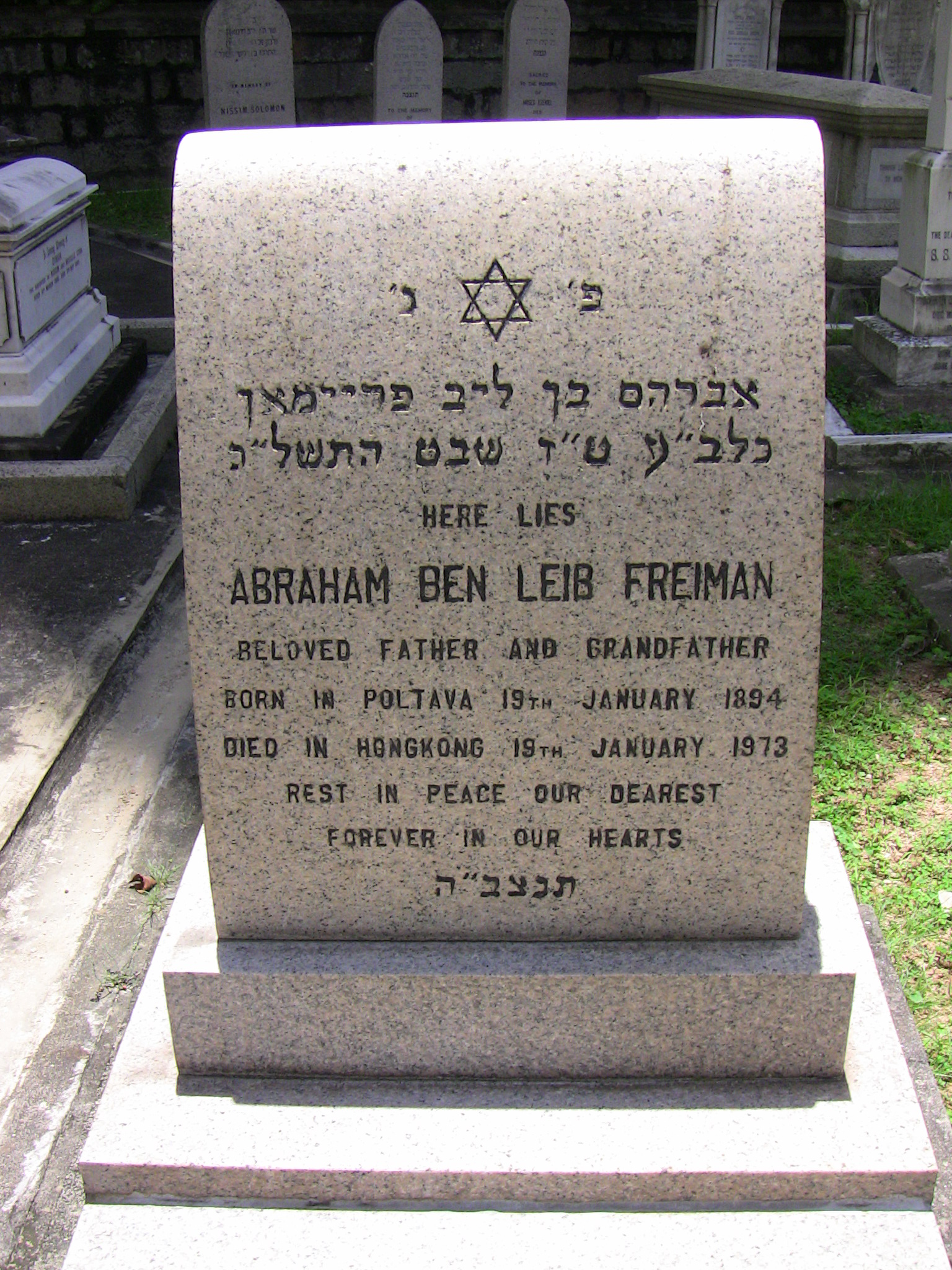 | Inscription (Eng) | HERE LIES ABRAHAM BEN LEIB FREIMAN BELOVED FATHER AND GRANDFATHER BORN IN POLTAVA 19TH JANUARY 1894 DIED IN HONGKONG 19TH JANUARY 1973 REST IN PEACE OUR DEAREST FOREVER IN OUR HEARTS |