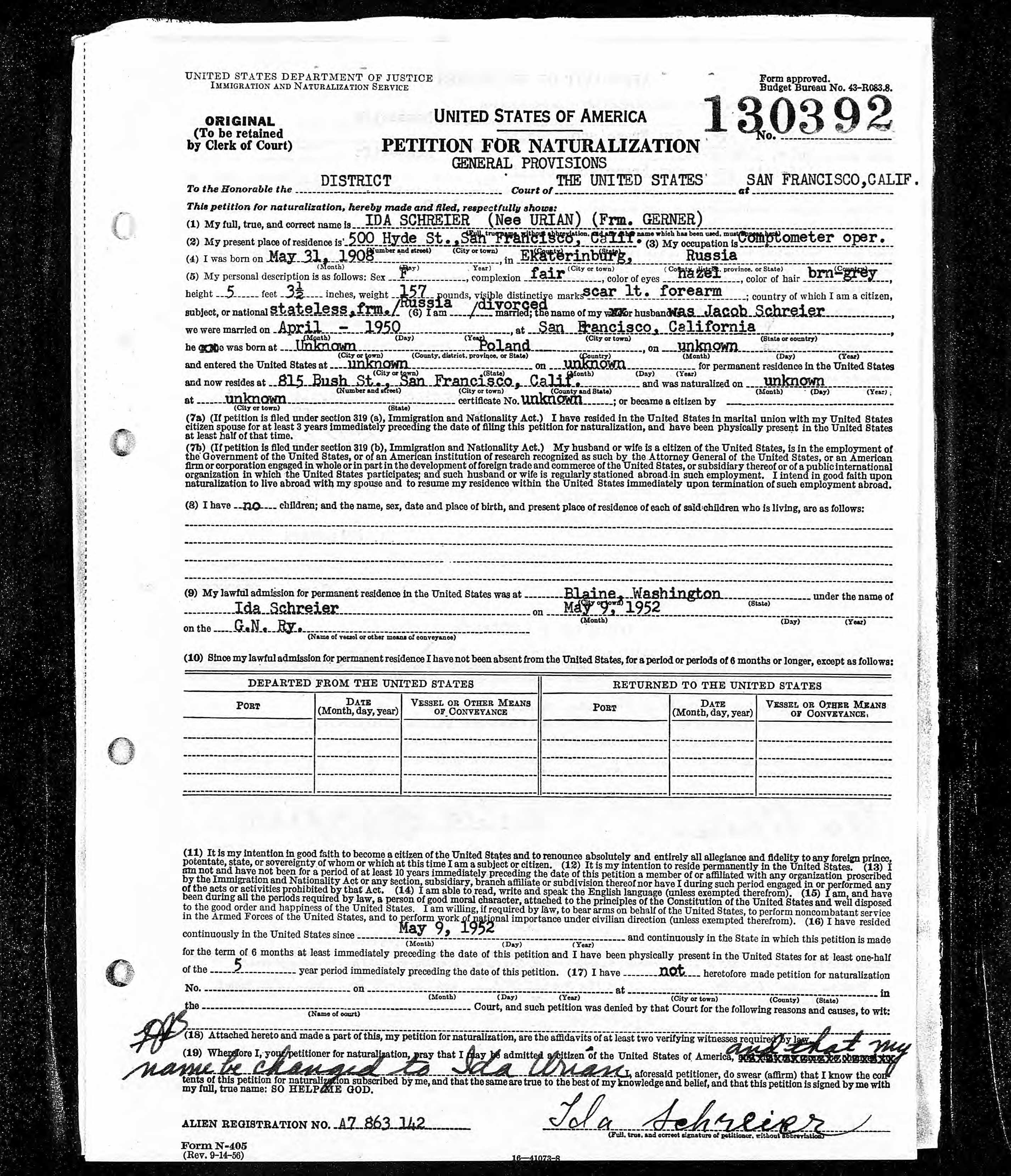 | Historical | His family was living in Harbin as early as 1916. Evsei and Ida came to HK in 1949 as refugees and were in transit to the US when Evsei died. Ida sailed from HK on February 4, 1950 to San Francisco en route to Philadelphia. Ida was born on May 31, 1908, in Ekaterinburg, Russia, making her 12 years younger than Evsei. She married Polish-born (Nadworna, Galicia now Nadvirna, Ukraine) Jacob Seide Schreier in San Francisco on April 25, 1950, but had already divorced him by the time she petitioned for naturalization in the US in May 1952. After that, she went by her maiden name, Ida Urian. She died on September 26, 1998. She had no children. |