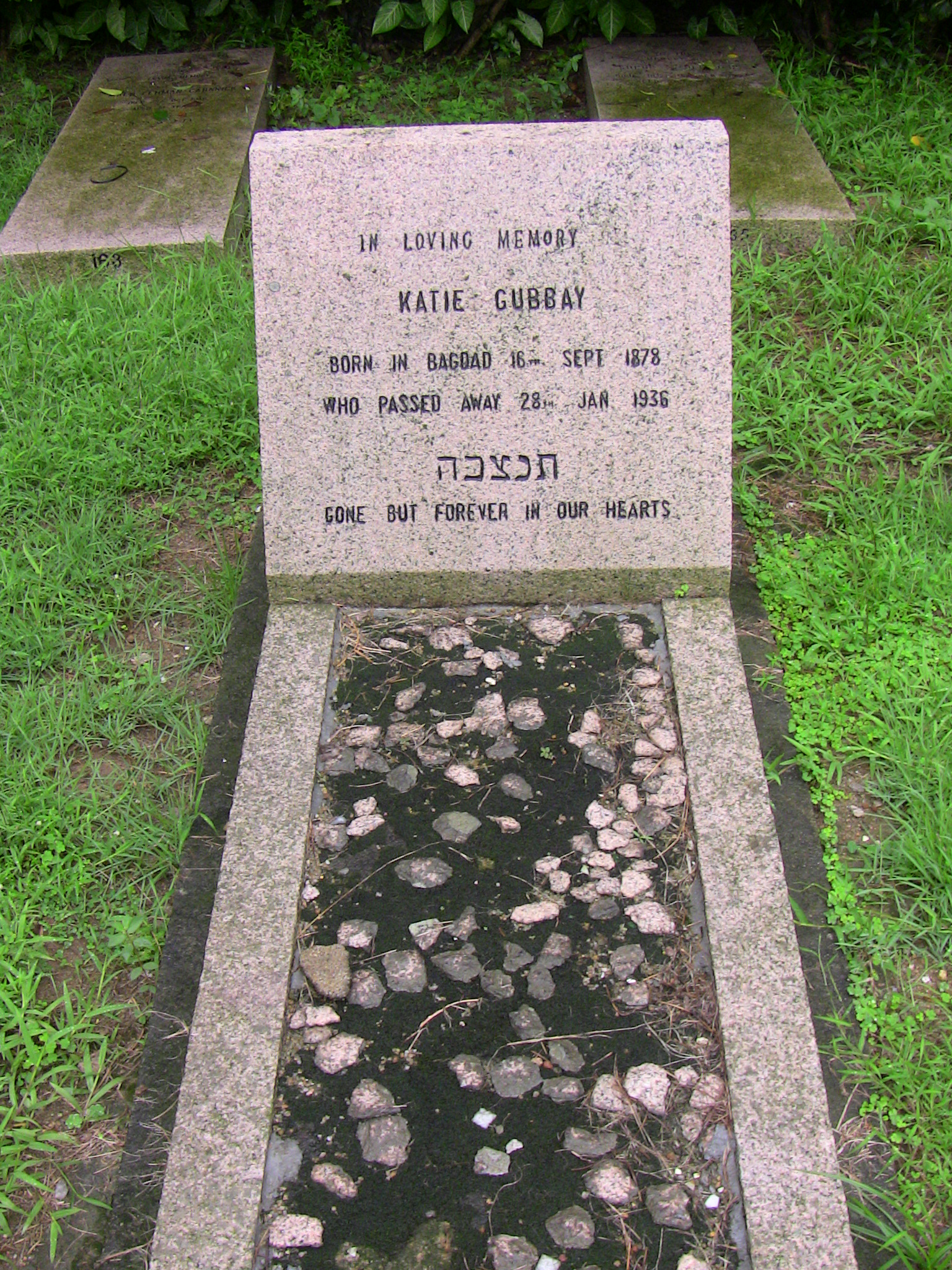 | Inscription (Eng) | IN LOVING MEMORY OF KATIE GUBBAY BORN IN BAGDAD 16TH SEPT. 1878 WHO PASSED AWAY 28TH JAN. 1936 GONE BUT FOREVER IN OUR HEARTS |