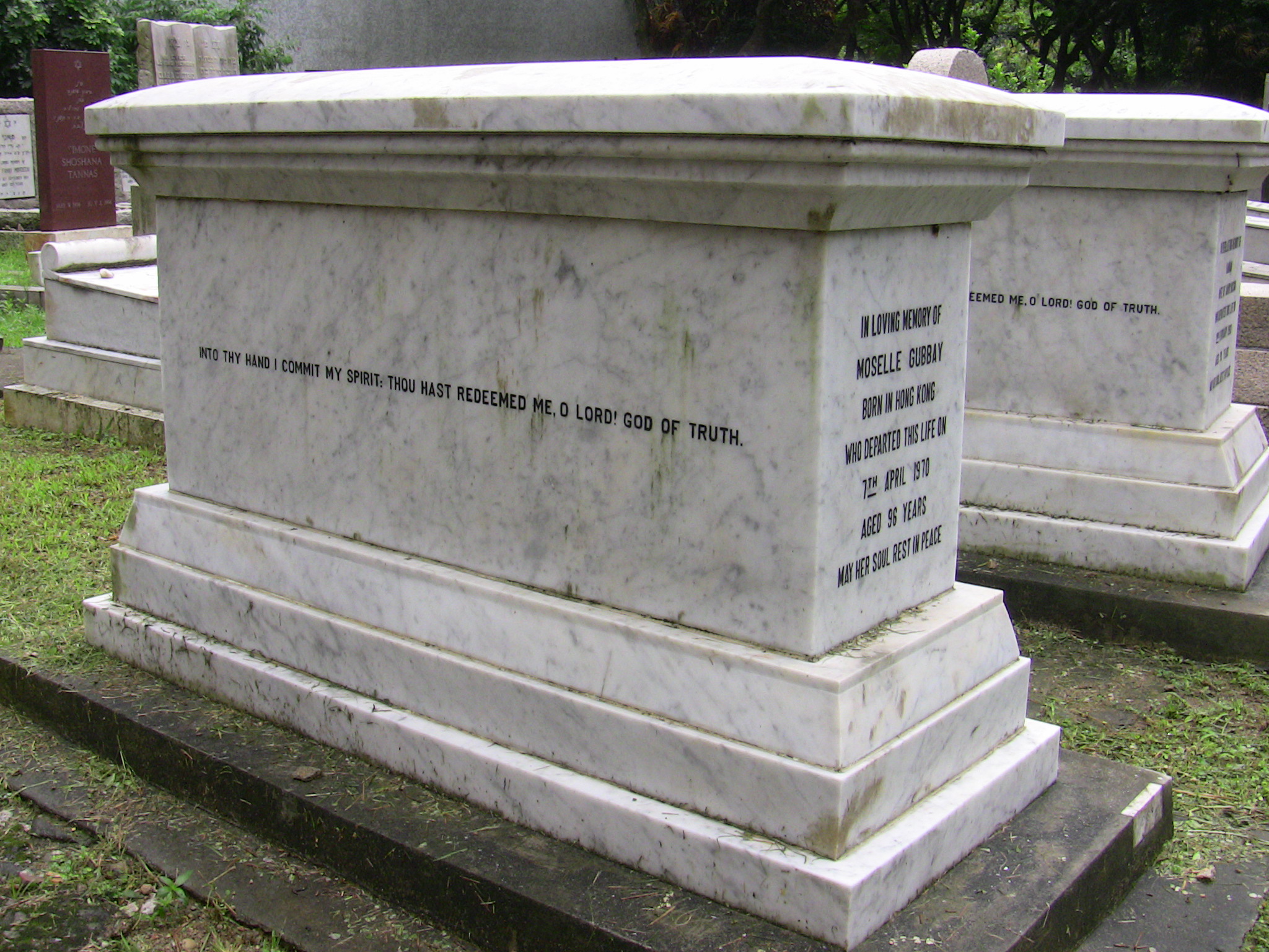 | Inscription (Eng) | IN LOVING MEMORY OF MOSELLE GUBBAY BORN IN HONG KONG WHO DEPARTED THIS LIFE ON 7TH APRIL 1970 AGED 96 YEARS MAY HER SOUL REST IN PEACE INTO THY HAND I COMMIT MY SPIRIT: THOU HAST REDEEMED ME, O LORD! GOD OF TRUTH |