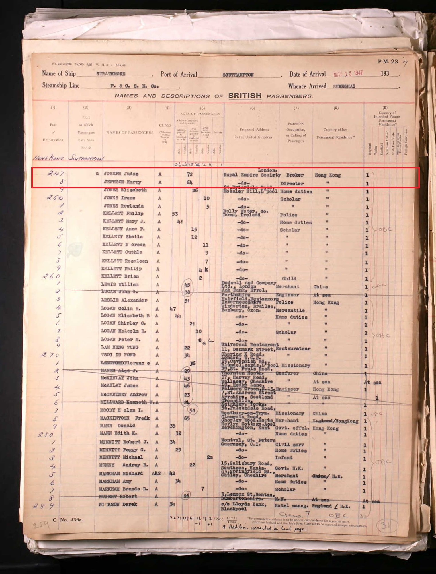 | Historical | He worked for S.J. David & Co. In 1925, he was living at 18 Conduit Road. He was interned at Stanley POW camp during WWII. He was living at the Repulse Bay Hotel when the Japanese arrested him. In December 1952, he sailed from HK to SF. He listed his American address c/o Miss L. Hope, 541 East 20th Street, Apt. 6A, NY, NY. At the time of his death, he was resident in the Peninsula Hotel, Room 346. The 1908 and 1909 jurors’ lists his brother, David Solomon Jephson, as working as a clerk at 3 Beaconsfield Arcade. He was an accountant. Perhaps David came to HK first as he shows up on earlier jurors’ lists than Harry does. |