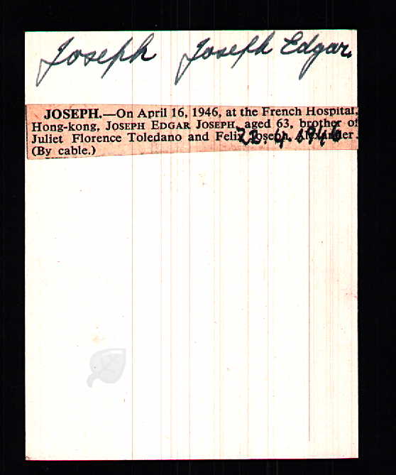 | Other Family Data | Uncle: Manasseh Abdulla Joseph (2E4). Siblings: Mozelle (b. 1875), Juliet Florence Toledano (b. 1875) and Felix Alexander Joseph (b. April 29, 1890, HK, d. September 30, 1949, Egham, UK). |