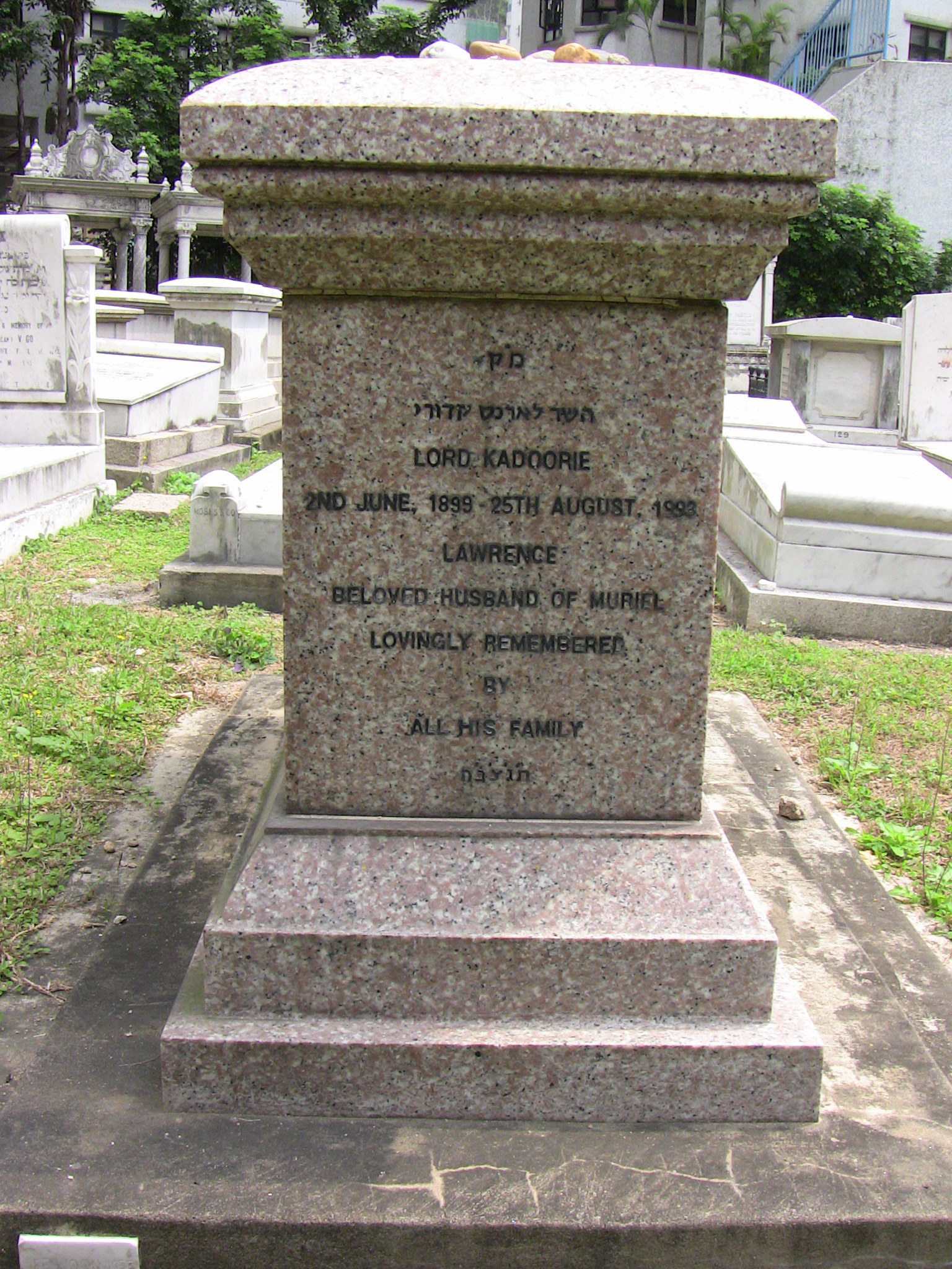 | Inscription (Eng) | LORD KADOORIE 2ND JUNE, 1899 – 25TH AUGUST, 1993 LAWRENCE BELOVED HUSBAND OF MURIEL LOVINGLY REMEMBERED BY ALL HIS FAMILY MAY HIS SOUL REST IN PEACE MAY HIS SOUL REST IN PEACE |