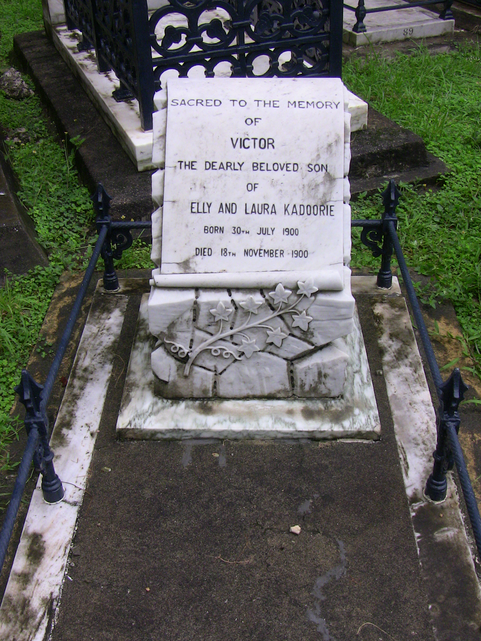 | Inscription (Eng) | SACRED TO THE MEMORY OF VICTOR THE DEARLY BELOVED SON OF ELLY AND LAURA KADOORIE BORN 30TH JULY 1900 DIED 18TH NOVEMBER 1900 |
