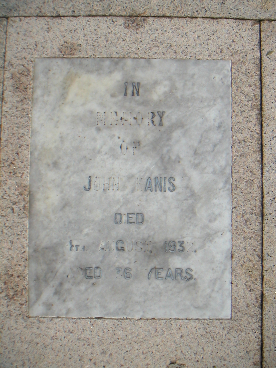 | Inscription (Eng) | IN MEMORY OF JOHN KANIS DIED 4TH AUGUST, 1932. AGED 36 YEARS. |