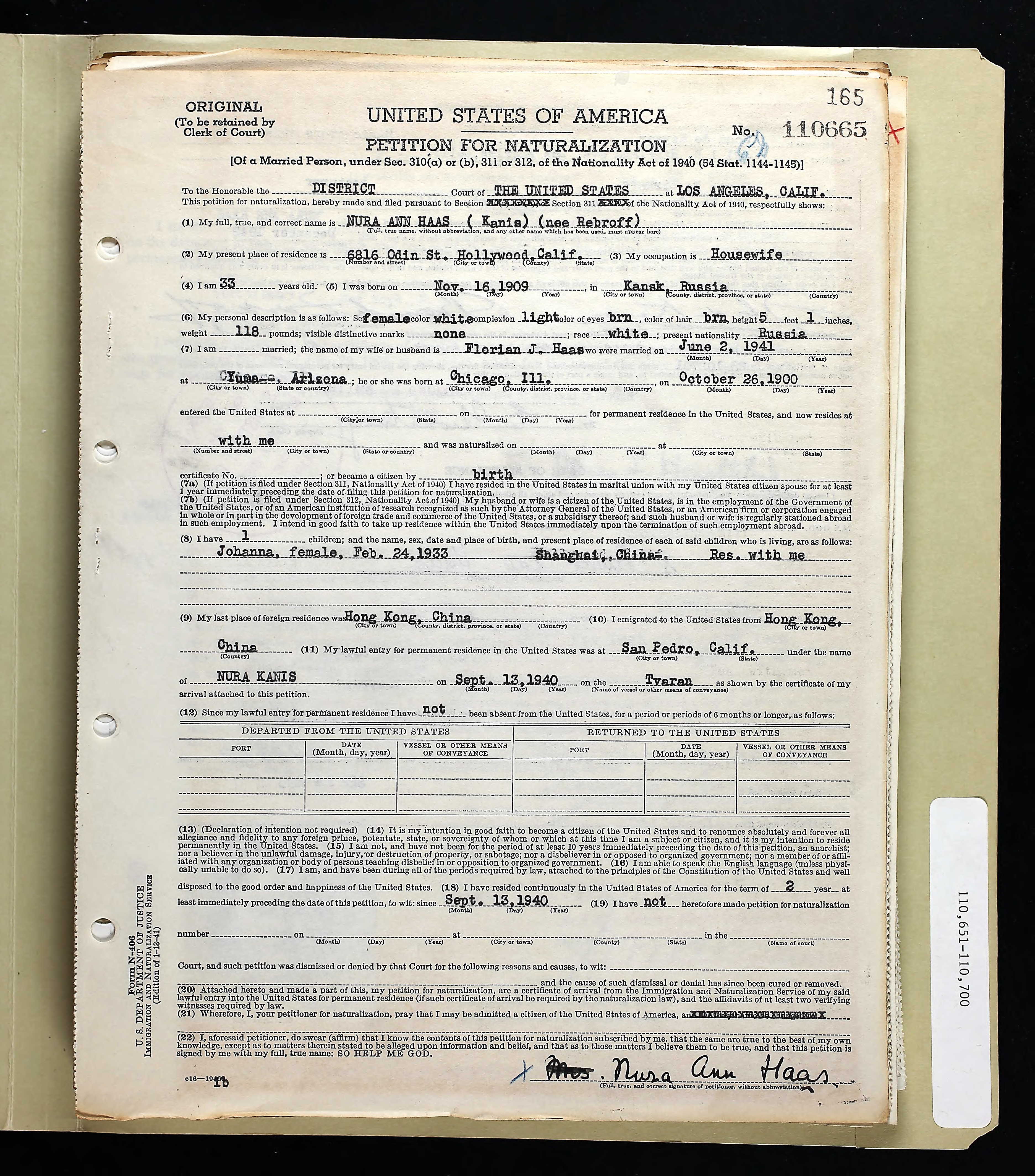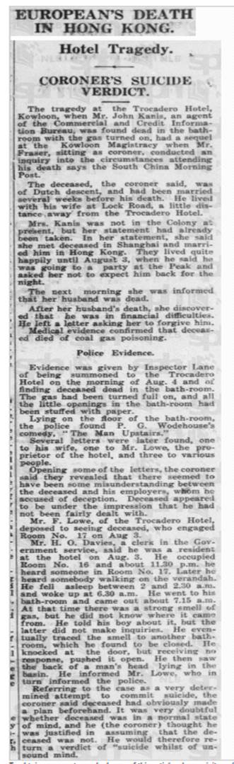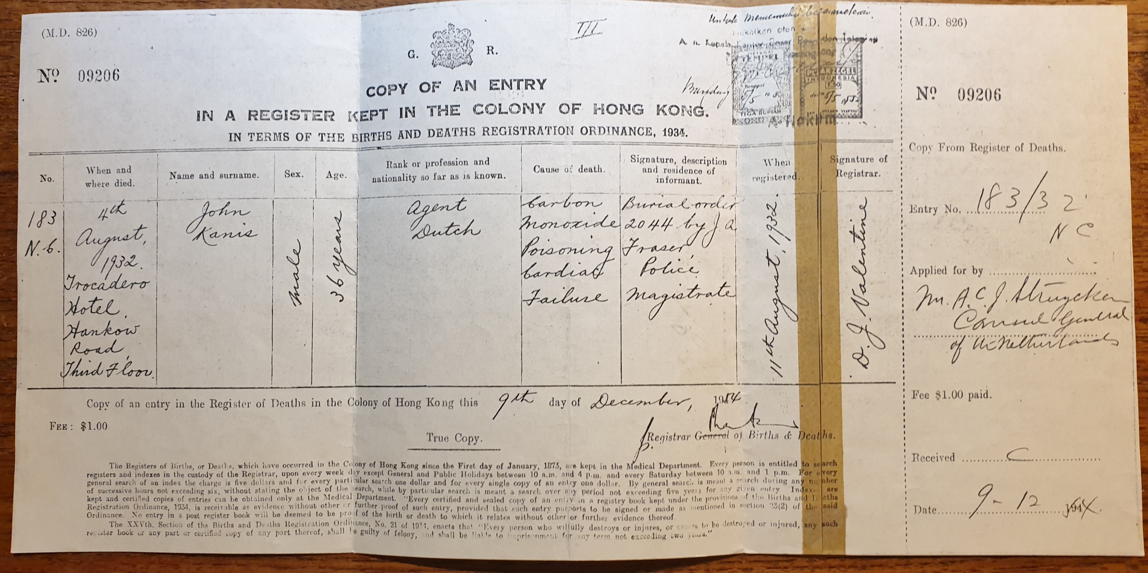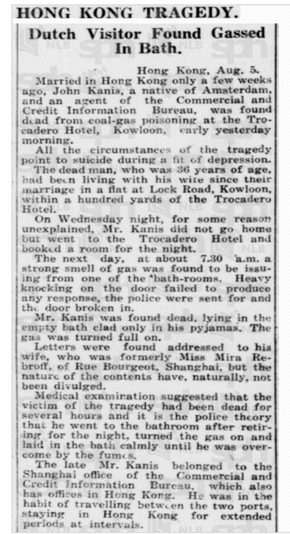 | Historical | Committed suicide at the Trocadero Hotel in Kowloon. Joan (b. February 24, 1933, Shanghai) was born six months after John committed suicide. John was previously married to Emma Robinson (b. August 2, 1896, Indonesia; d. October 25, 1977, The Netherlands). They were married on February 11, 1917 in Ambarawa, Central Java, Indonesia, near where he was stationed in the Dutch army. They had five children together – Adèle Johanna Kanis Van Straaten (b. May 17, 1917; d. January 27, 2000), John Kanis (b. June 3, 1918; d. February 19, 1995), Felix Emmanuel Kanis (b. August 16, 1920; d. December 28, 1994), Max Kanis (b. 1921) and Sybile Kanis (b. 1921). Max and Sybile were twins. He died at three months; she died at ten months. According to newspaper reports, Nura was the pianist in David Jacob Wolff’s (4D7) trio at the Gloucester Hotel. The trio debuted on June 1, 1935 but ended with Wolff’s death on July 30 that same year. Nura (b. November 17, 1909, Kansk, Russia; d. May 8, 1996, San Diego) married Florian Joseph Haas in Arizona on May 2, 1941. They were living in San Diego at the time but it seems they were living in Hollywood in 1943. On the marriage certificate, Florian states his age as 37, meaning he was born around 1904. However, his WWII draft registration has his DOB as October 26, 1894, a 1940 ship’s manifest lists it as October 27, 1898, and his death certificate lists it as August 28, 1895. John’s mother died in the Sobibor concentration camp on April 2, 1943. |