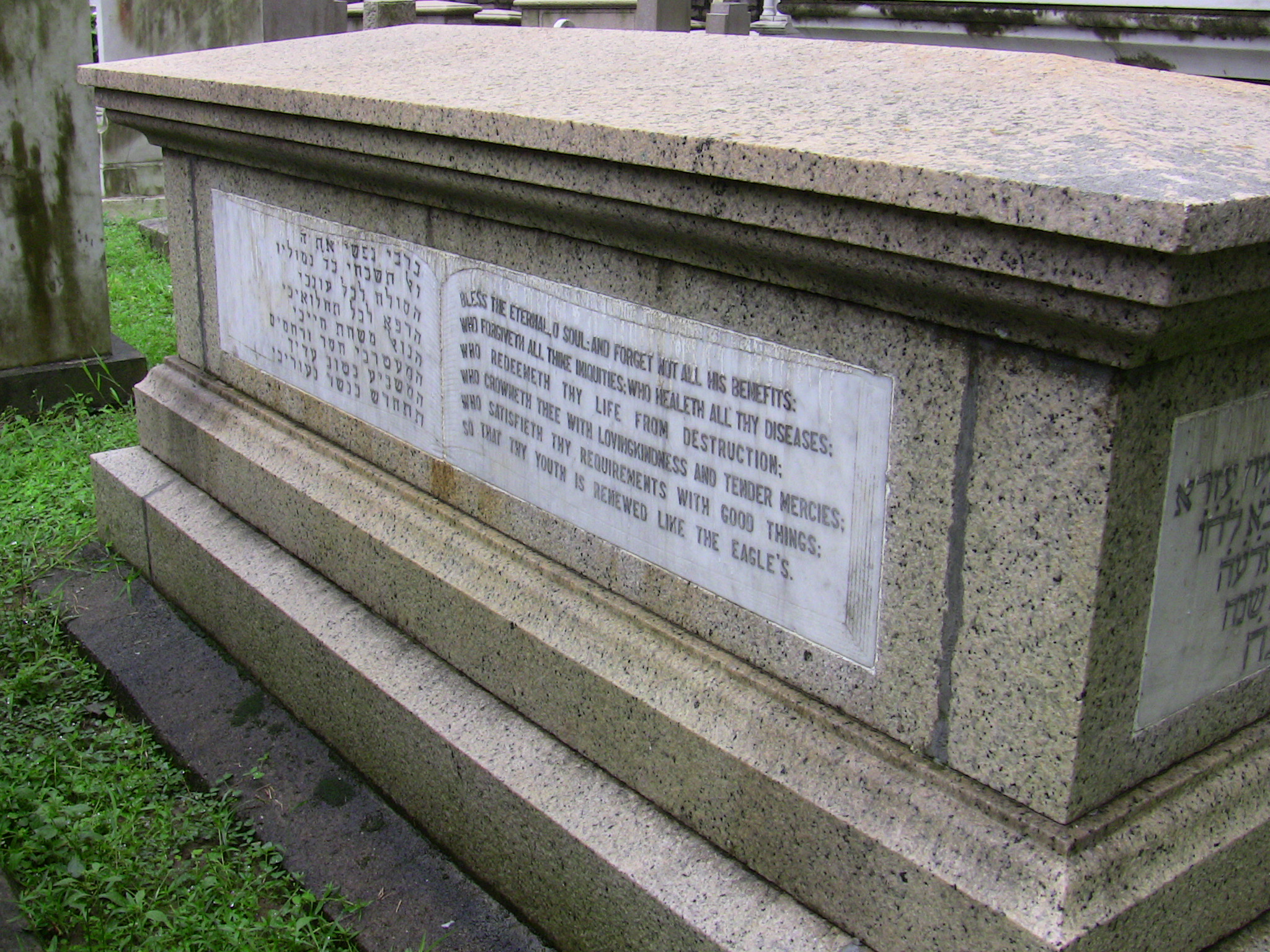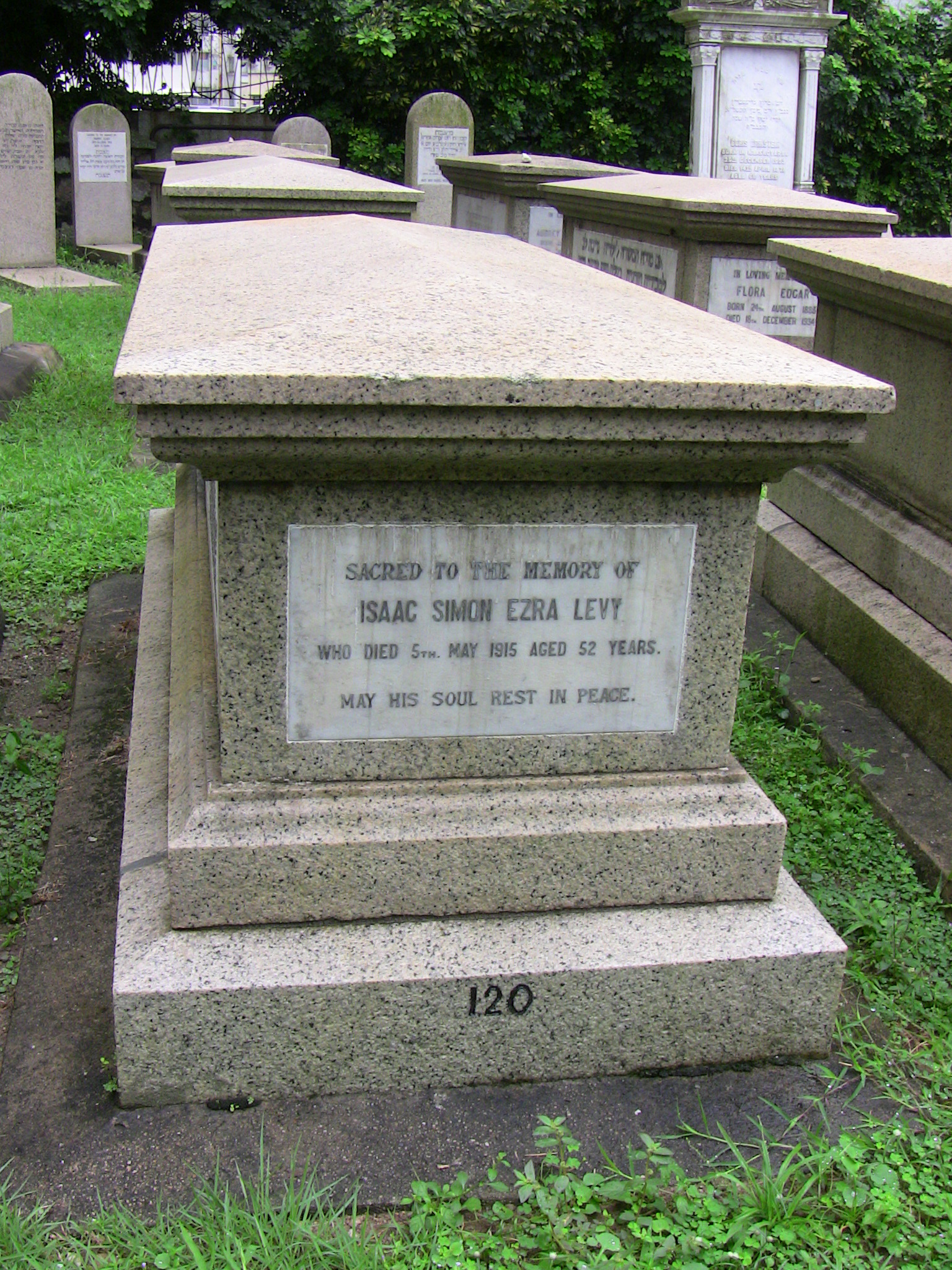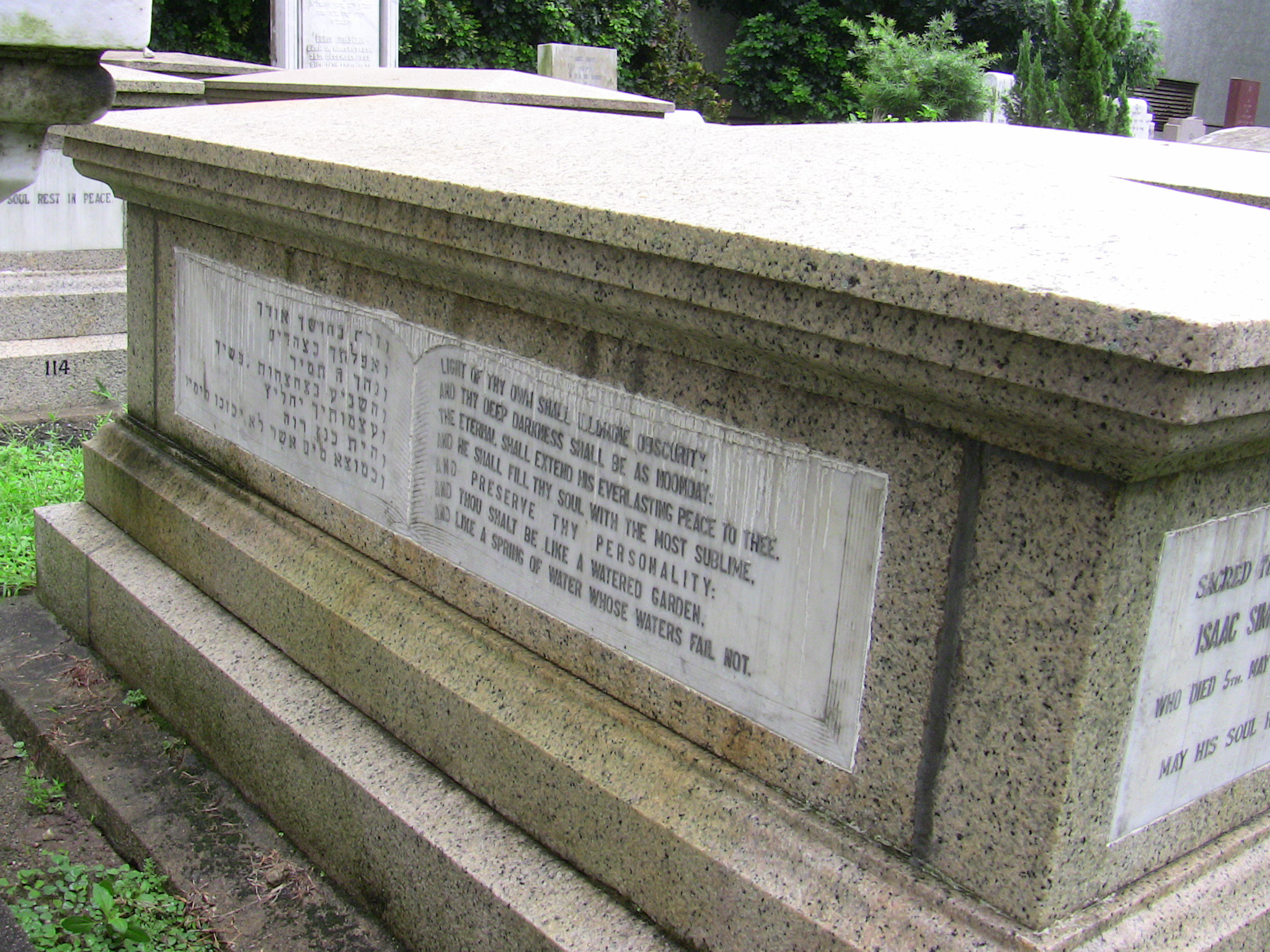 | Inscription (Eng) | SACRED TO THE MEMORY OF ISAAC SIMON EZRA LEVY WHO DIED 5TH MAY 1915 AGED 52 YEARS. MAY HIS SOUL REST IN PEACE LIGHT OF THY OWN SHALL ILLUMINE OBSCURITY, AND THY DEEP DARKNESS SHALL BE AS NOONDAY; THE ETERNAL SHALL EXTEND HIS EVERLASTING PEACE TO THEE, AND HE SHALL FILL THY SOUL WITH THE MOST SUBLIME, AND PRESERVE THY PERSONALITY: AND THOU SHALT BE LIKE A WATERED GARDEN, AND LIKE A SPRING OF WATER WHOSE WATERS FAIL NOT. BLESS THE ETERNAL, O SOUL; AND FORGET NOT ALL HIS BENEFITS; WHO FORGIVETH ALL THINE INIQUITIES: WHO HEALETH ALL THY DISEASES; WHO REDEEMETH THY LIFE FROM DESTRUCTION; WHO CROWNETH THEE WITH LOVING KINDNESS AND TENDER MERCIES; WHO SATISFIETH THY REQUIREMENTS WITH GOOD THINGS; SO THAT THY YOUTH IS RENEWED LIKE THE EAGLES. |
