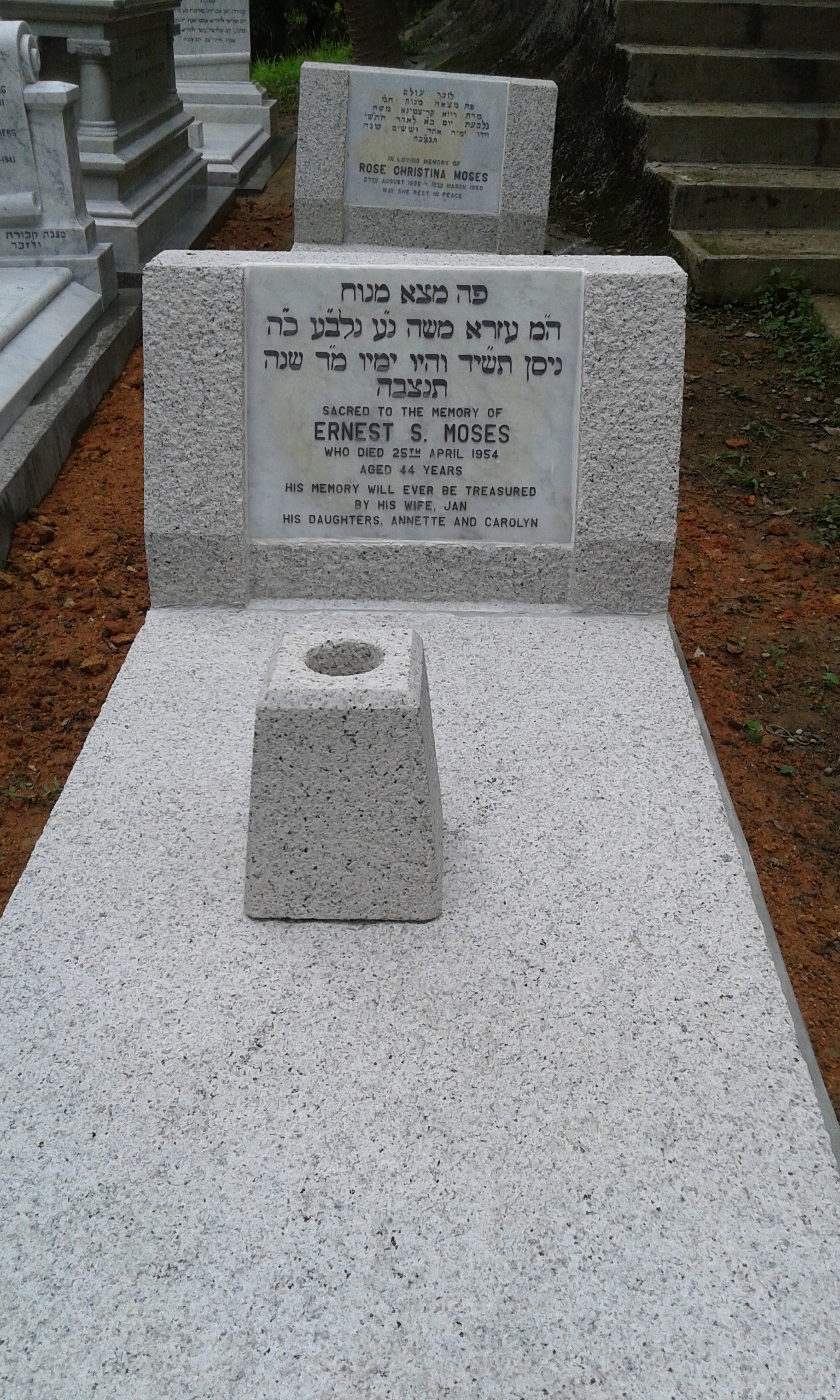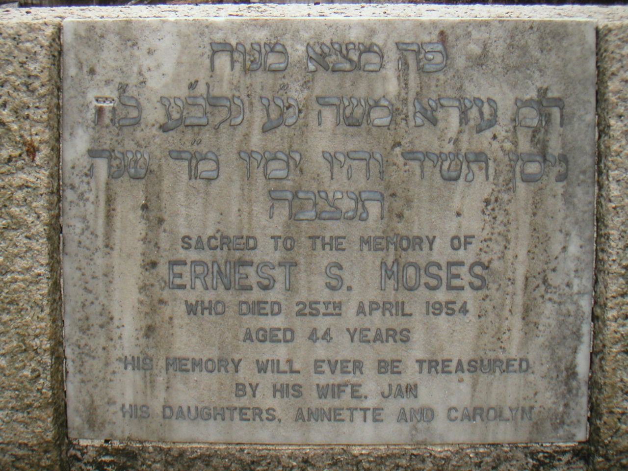| Inscription (Eng) | SACRED TO THE MEMORY OF ERNEST S. MOSES WHO DIED 25TH APRIL 1954 AGED 44 YEARS HIS MEMORY WILL EVER BE TREASURED BY HIS WIFE, JAN HIS DAUGHTERS: ANNETTE AND CAROLYN |