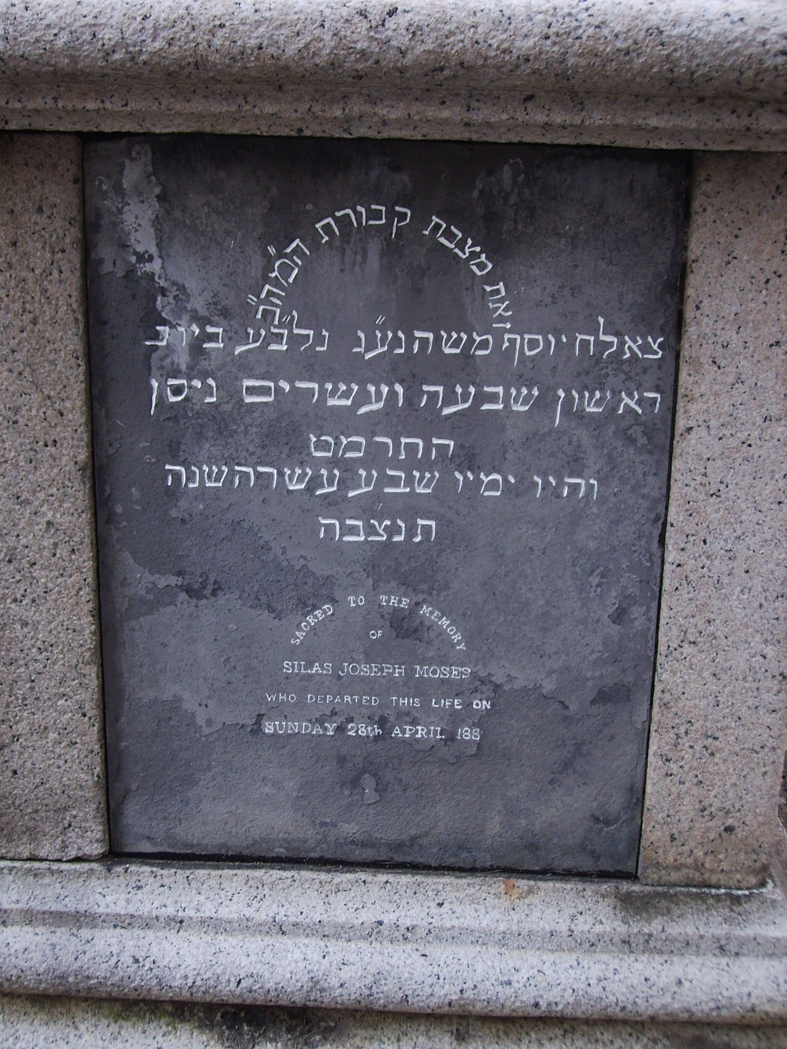 | Inscription (Eng) | SACRED TO THE MEMORY OF SILAS JOSEPH MOSES WHO DEPARTED THIS LIFE ON SUNDAY, 28TH APRIL 1889 ______ E ______ ______OUL R ____ |