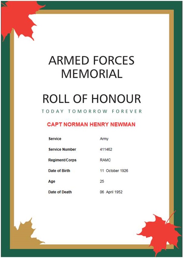 | Inscription (Eng) | NORMAN HENRY NEWMAN CAPT., R.A.M.C. ATTD – 23RD FLD. REGT., R.A. BORN 11TH OCTOBER 1926 DIED WHILST RENDERING AID TO HIS FELLOW-MEN 6TH APRIL 1952 AGED 25 YEARS. DEEPLY MOURNED BY HIS LOVING MOTHER AND BROTHER |
