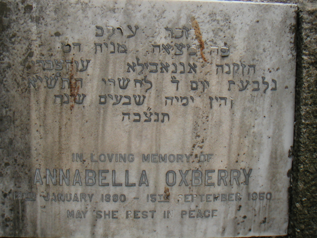 | Inscription (Eng) | IN LOVING MEMORY OF ANNABELLA OXBERRY 18TH JANUARY 1880 – 15TH SEPTEMBER 1950 MAY SHE REST IN PEACE |
