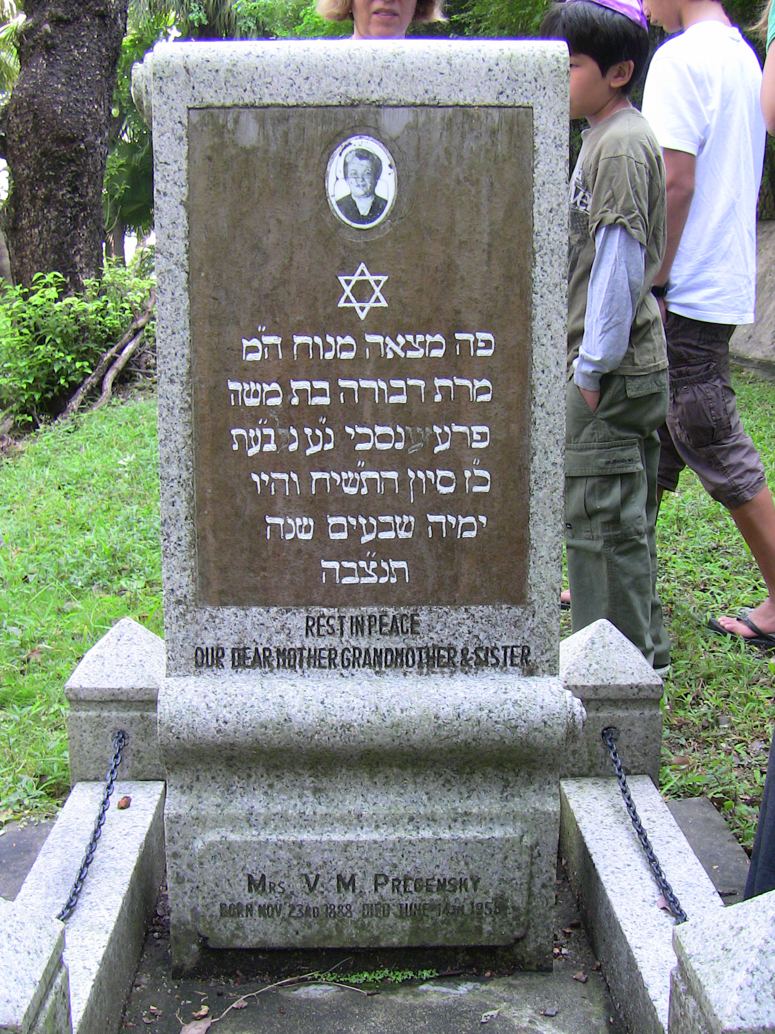 | Inscription (Other) | (Foot of stone, front edge) CARVED BY KEE STON [sic] E MILLER KOWLOON CITY TEL: 568884 (Rear) В. М. ПРЕЖЕНСКАЯ род 23 ноября 1888 сконч 14 июня 1958 спи Покойся -оро–я мама, бабушка и сесмра [сестра] |