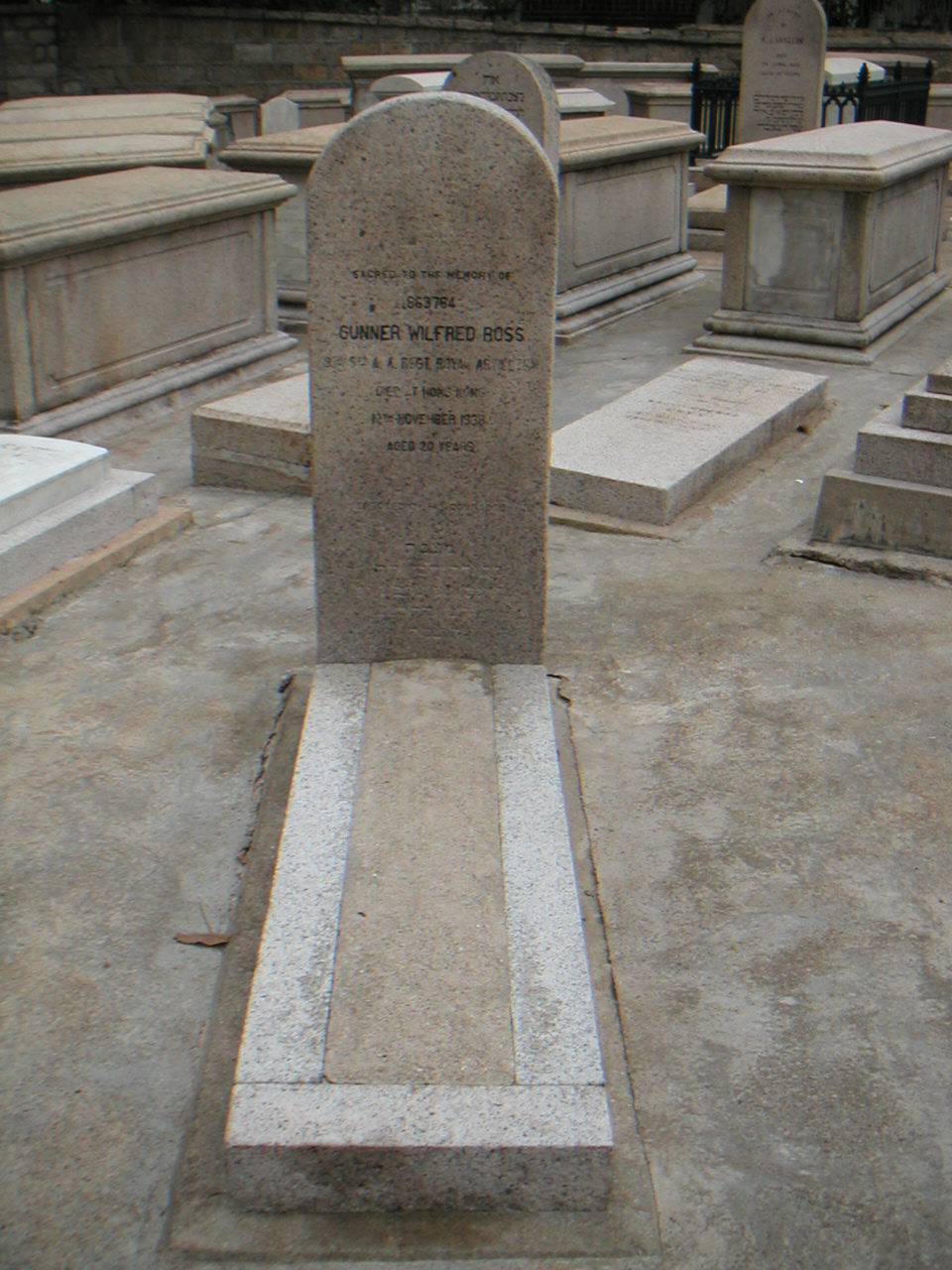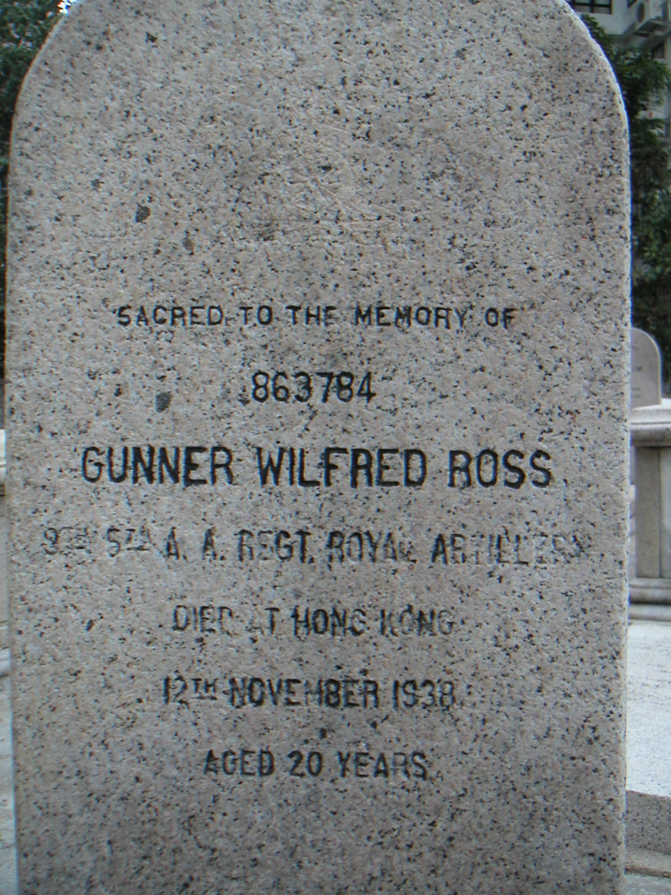 | Inscription (Eng) | SACRED TO THE MEMORY OF 863784 GUNNER WILFRED ROSS 9TH/5TH A.A. REGT. ROYAL ARTILLERY DIED AT HONG KONG 12TH NOVEMBER 1938. AGED 20 YEARS ERECTED BY HIS COMRADES |