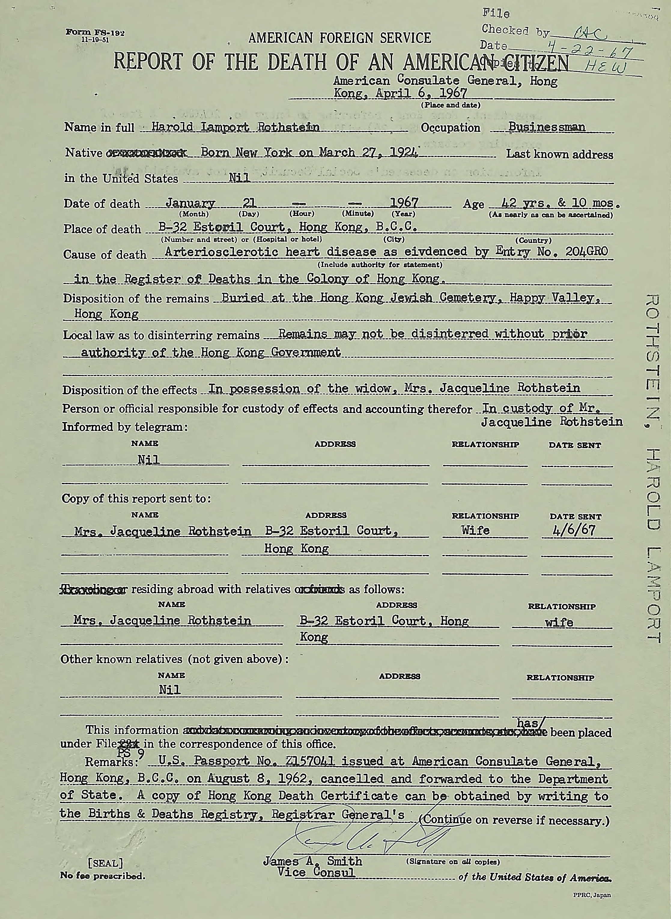| Inscription (Eng) | HAROLD L ROTHSTEIN BORN MAR 27, 1924 NEW YORK DIED JAN 21, 1967 HONG KONG BELOVED HUSBAND OF JACQUELINE AND FATHER OF RONALD AND LISA |