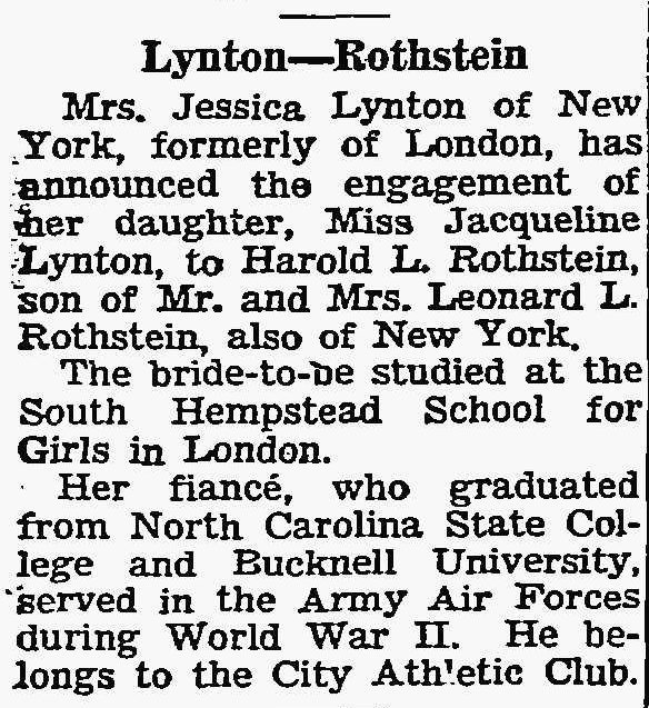 | Other Family Data | Children: Ronald & Lisa After Harold’s death, Jacqueline married John P. Rosenthal. She died on September 22, 2005 and is buried at Mount Ararat Cemetery in NY. Ronald is married to Karyn and may be living in Baltimore. Lisa changed her name to Rosenthal. |