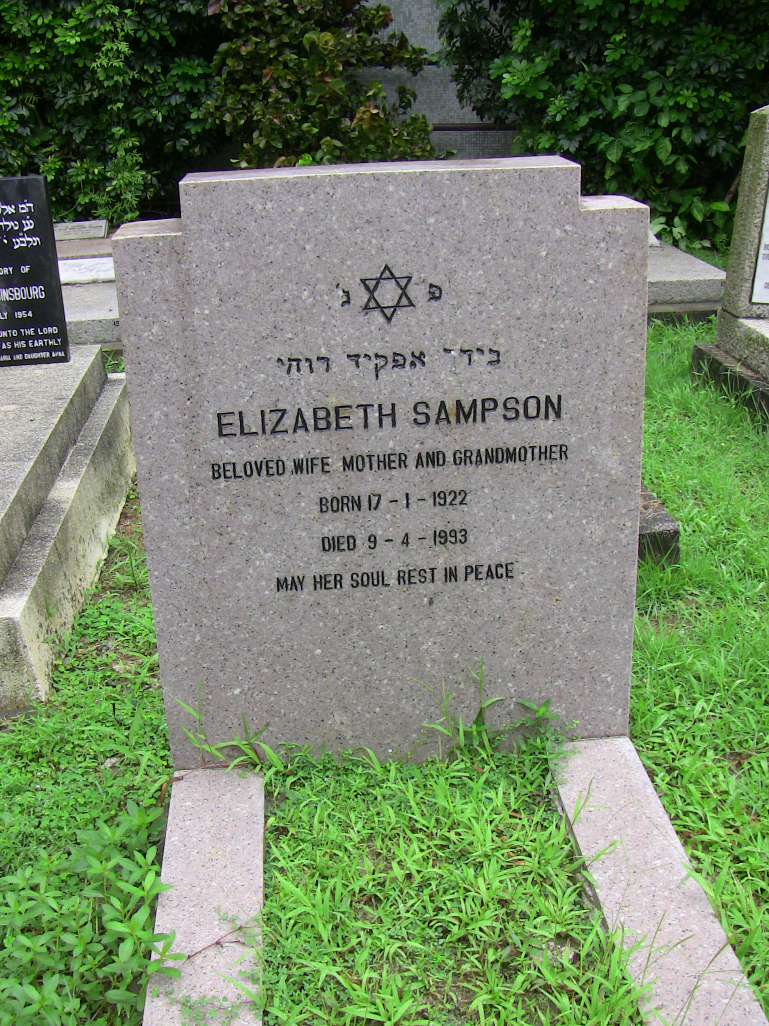 | Inscription (Eng) | ELIZABETH SAMPSON BELOVED WIFE MOTHER AND GRANDMOTHER BORN 17-1-1922 DIED 9-4-1993 MAY HER SOUL REST IN PEACE |