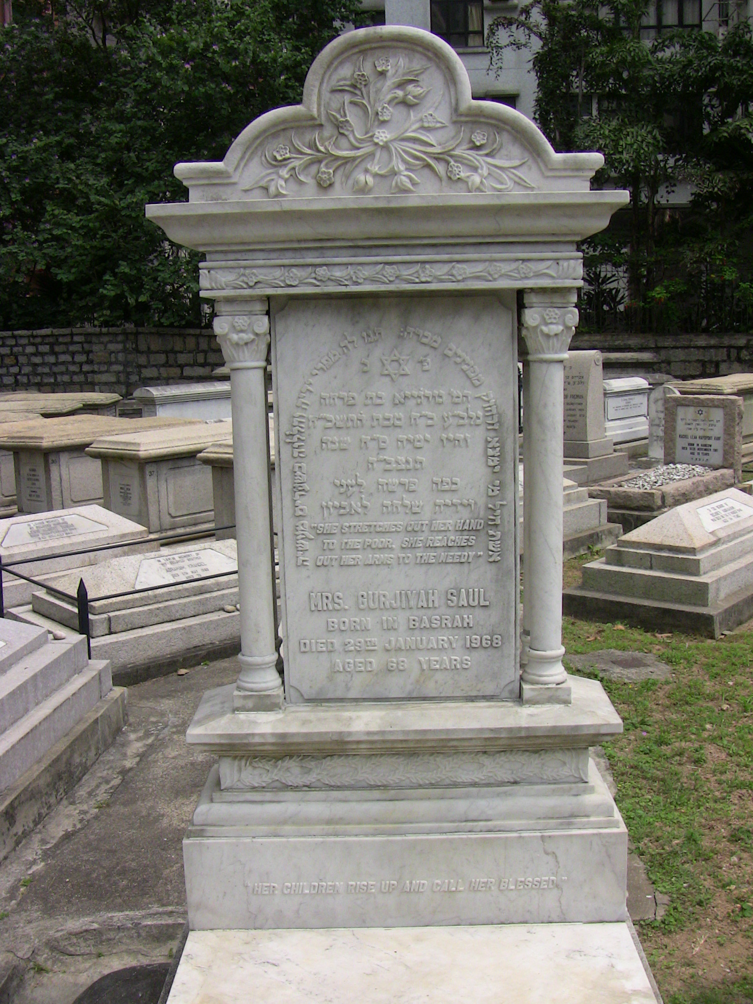 | Inscription (Eng) | “SHE STRETCHES OUT HER HAND TO THE POOR, SHE REACHES OUT HER ARMS TO THE NEEDY” MRS. GURJIYAH SAUL BORN IN BASRAH DIED 29TH JANUARY 1968 AGED 68 YEARS “HER CHILDREN RISE UP AND CALL HER BLESSED” |