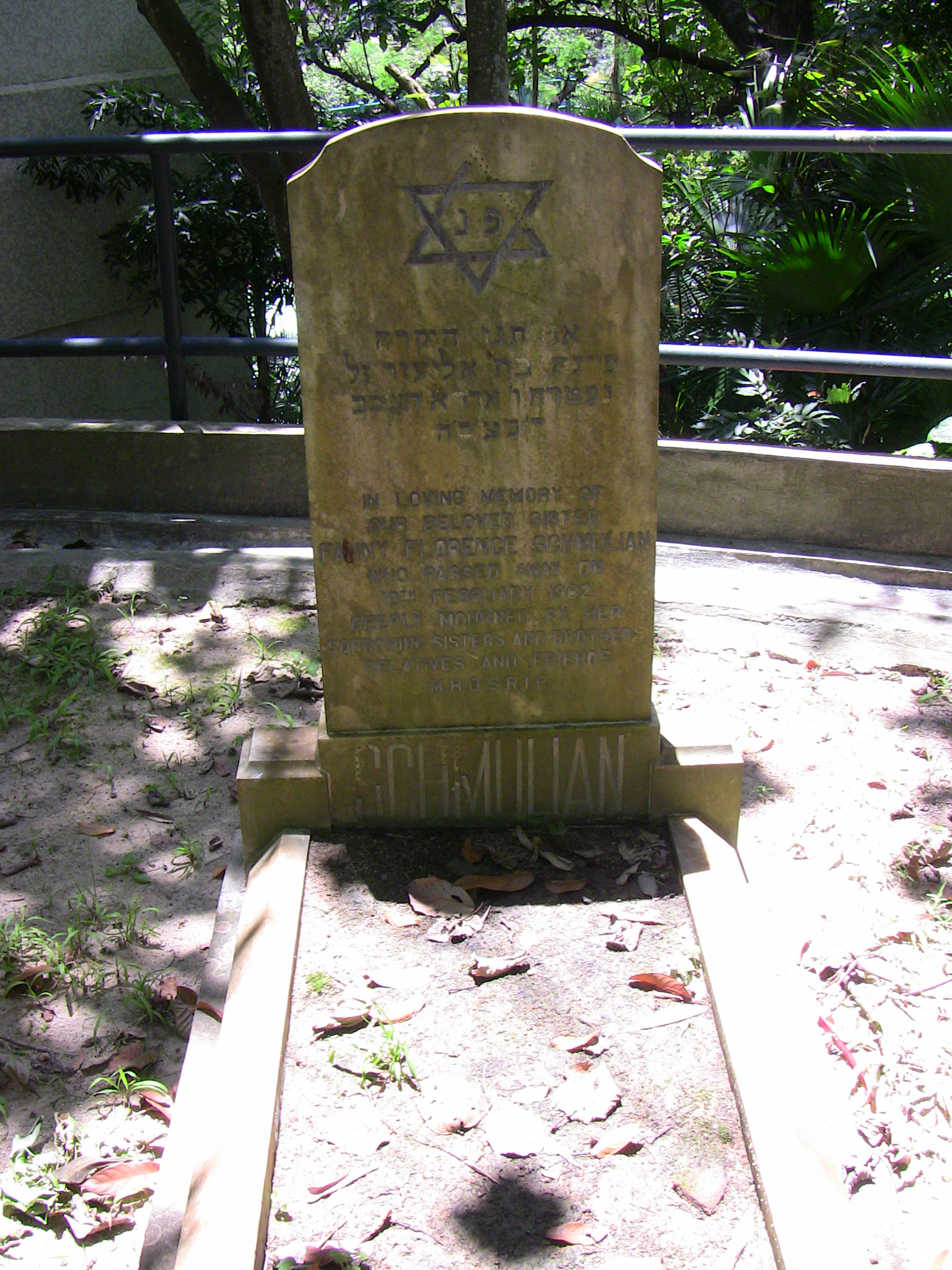| Inscription (Eng) | IN LOVING MEMORY OF OUR BELOVED SISTER FANNY FLORENCE SCHMULIAN WHO PASSED AWAY ON 10TH FEBRUARY 1962 DEEPLY MOURNED BY HER SORROWING SISTERS AND BROTHERS RELATIVES AND FRIENDS M.H.D.S.R.I.P. [May her departed soul rest in peace] SCHMULIAN |