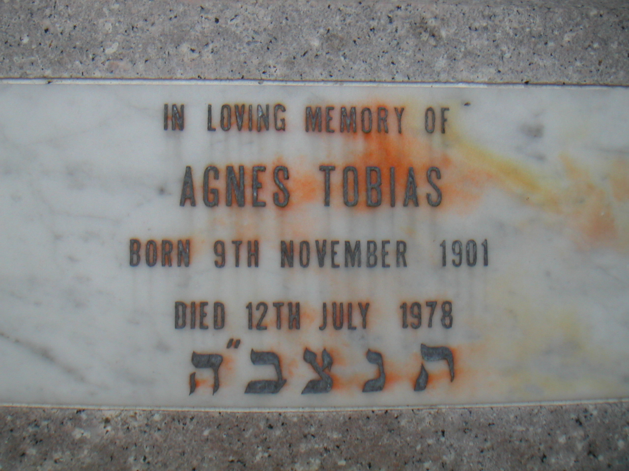 | Inscription (Eng) | IN LOVING MEMORY OF AGNES TOBIAS BORN 9TH NOVEMBER 1901 DIED 12TH JULY 1978 |