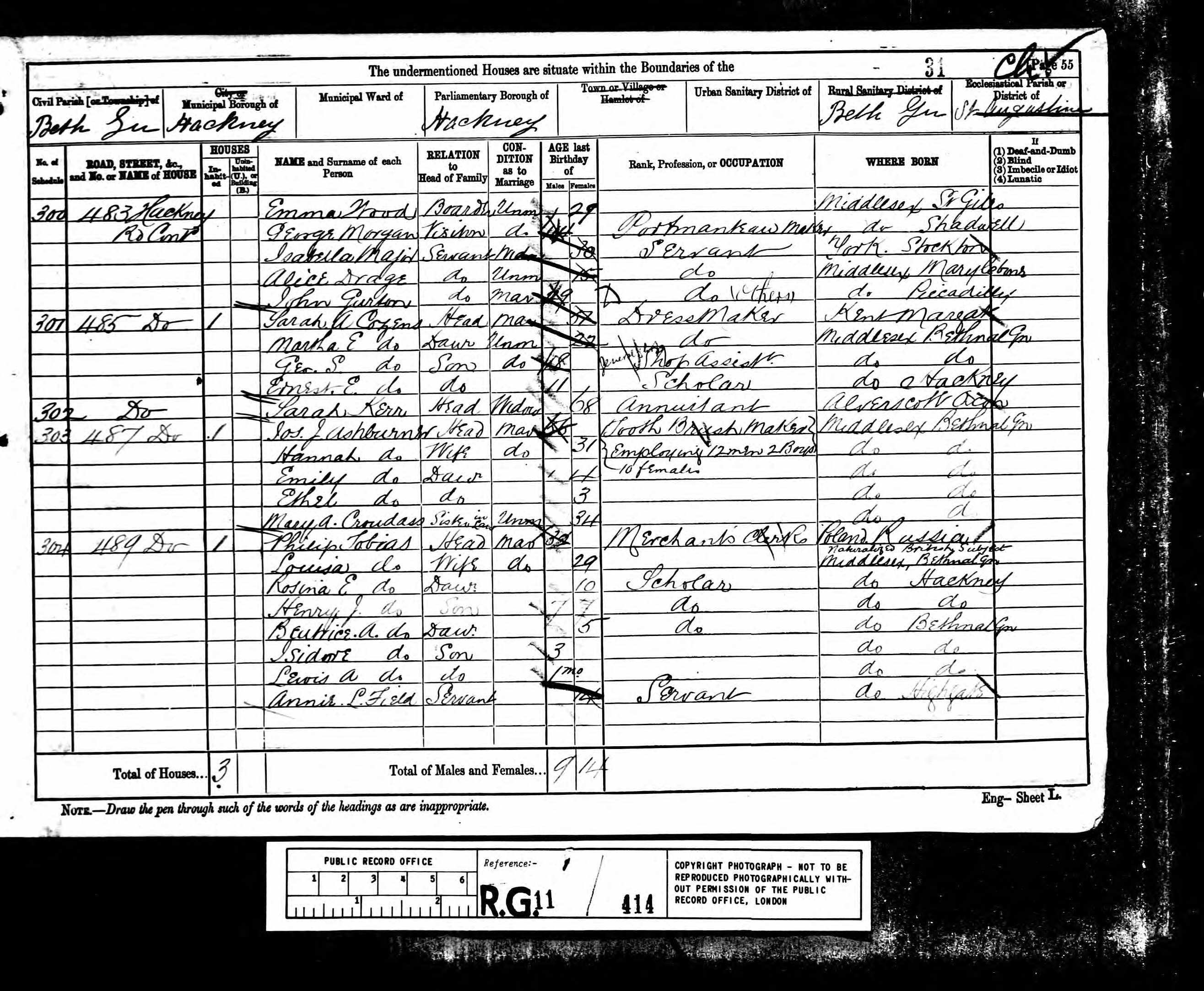 | Other Family Data | Siblings: Rosina Elizabeth Tobias Hammond (b. March 29, 1871, Hackney; d. June 22, 1955, Essex, UK), Henry Israel Tobias (b. 1874, Hackney; d. February 29, 1960, Essex, UK), Beatrice Ada Tobias (b. December 4, 1876, Bethnal Green; d. August 26, 1942, Essex, UK) and Isidore Tobias (b. April 3, 1878, Bethnal Green; d. March 4, 1947, Hempstead, NY) He had no children. |