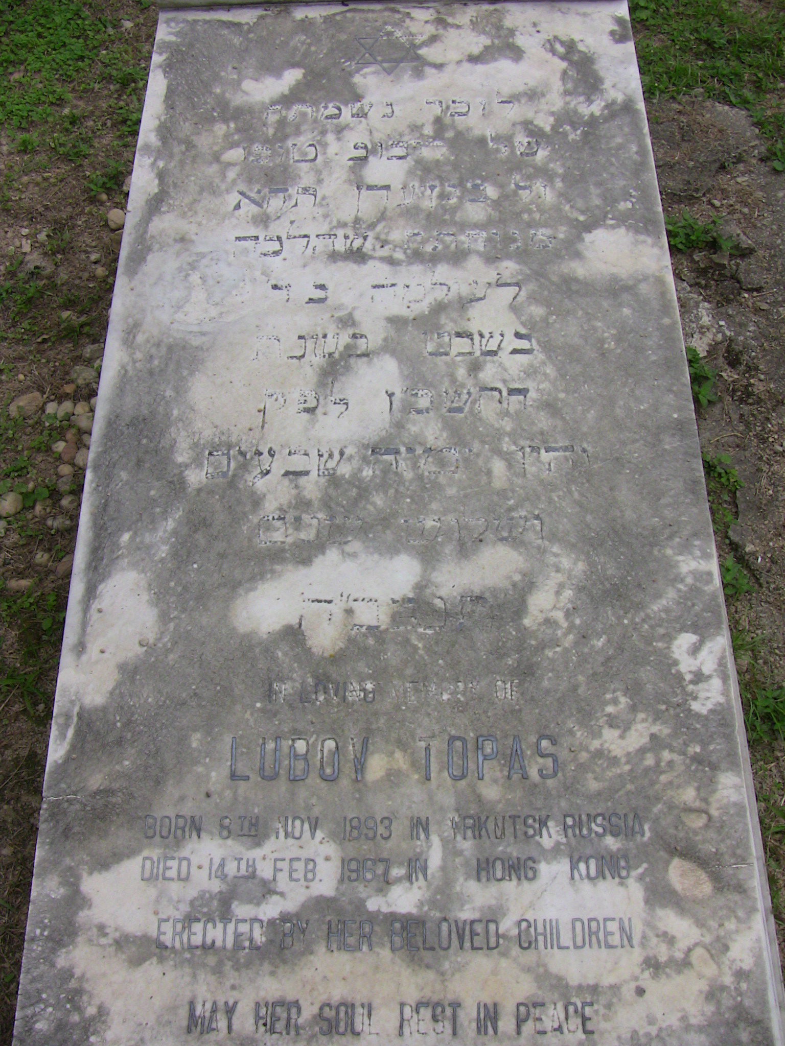 | Inscription (Eng) | IN LOVING MEMORY OF LUBOV TOPAS BORN 6TH NOV. 1893 IN IRKUTSK RUSSIA DIED 14TH FEB. 1967 IN HONG KONG ERECTED BY HER BELOVED CHILDREN MAY HER SOUL REST IN PEACE |
