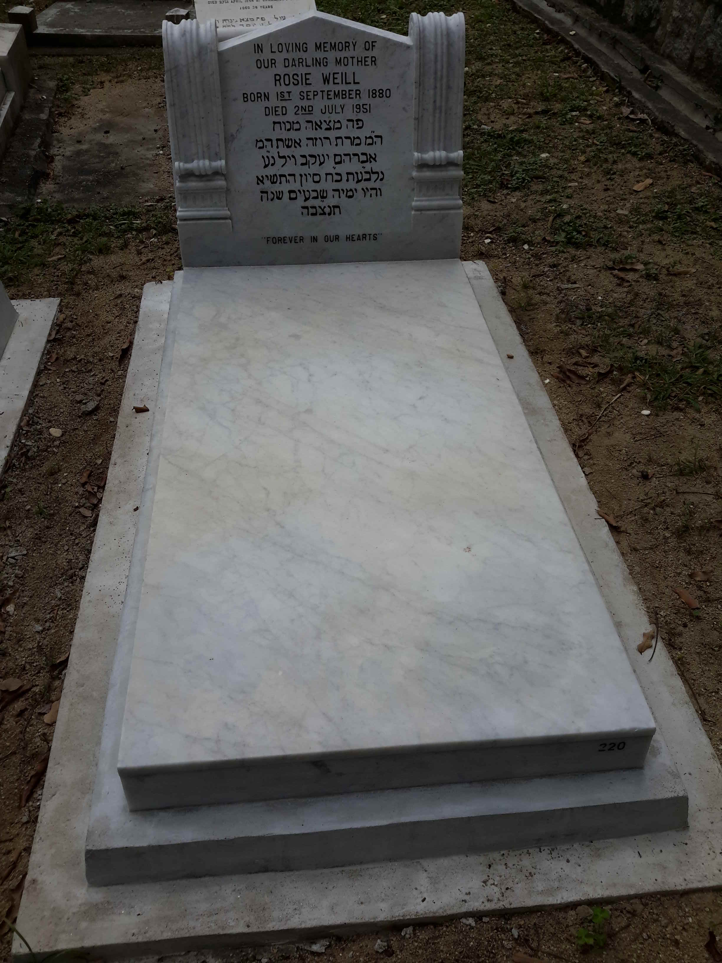| Inscription (Eng) | IN LOVING MEMORY OF OUR DARLING MOTHER ROSIE WEILL BORN 1ST SEPTEMBER 1880 DIED 2ND JULY 1951 “FOREVER IN OUR HEARTS” |