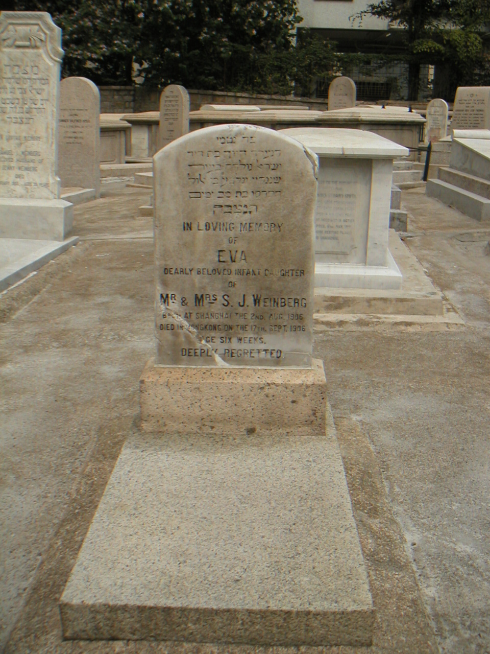 | Inscription (Eng) | IN LOVING MEMORY OF EVA DEARLY BELOVED INFANT DAUGHTER OF MR. & MRS. S. J. WEINBERG BORN AT SHANGHAI THE 2ND. AUG. 1906 DIED IN HONGKONG ON THE 17TH. SEPT. 1906 AGE SIX WEEKS. DEEPLY REGRETTED. |
