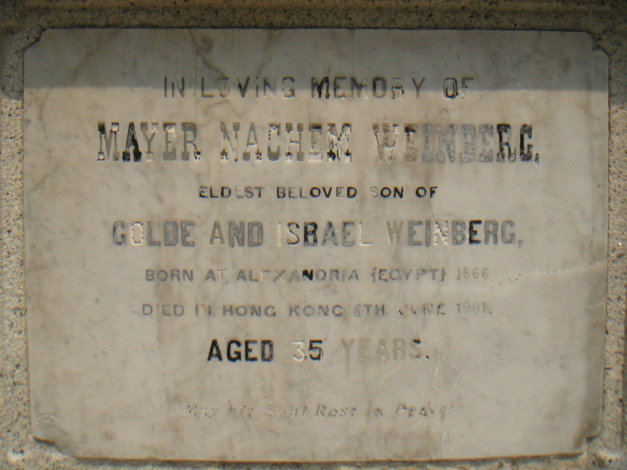 | Inscription (Eng) | IN LOVING MEMORY OF MAYER NACHEM WEINBERG, ELDEST BELOVED SON OF GOLDE AND ISRAEL WEINBERG, BORN AT ALEXANDRIA {EGYPT} 1866 DIED IN HONGKONG 8TH JUNE 1901. AGED 35 YEARS. MAY HIS SOUL REST IN PEACE! |
