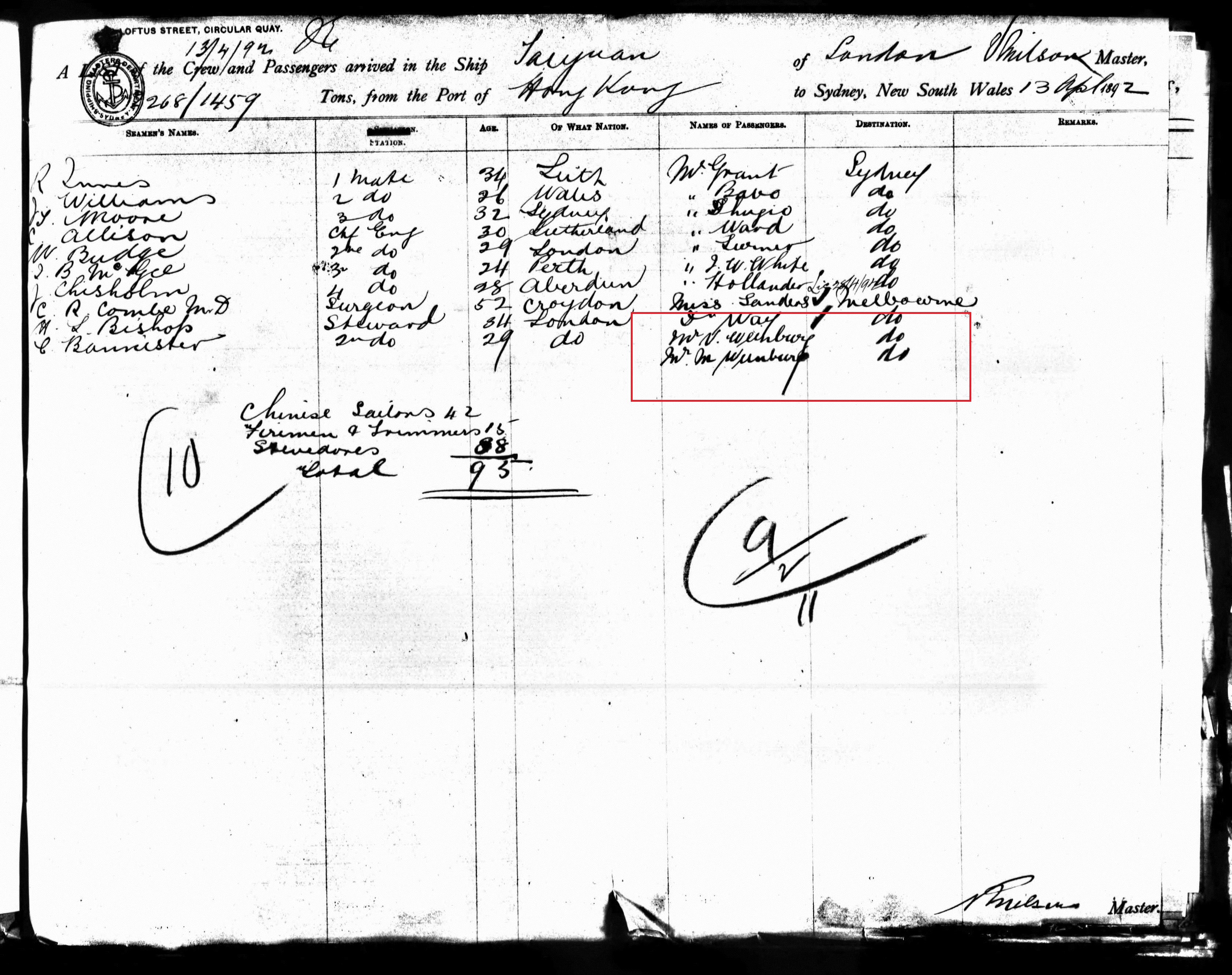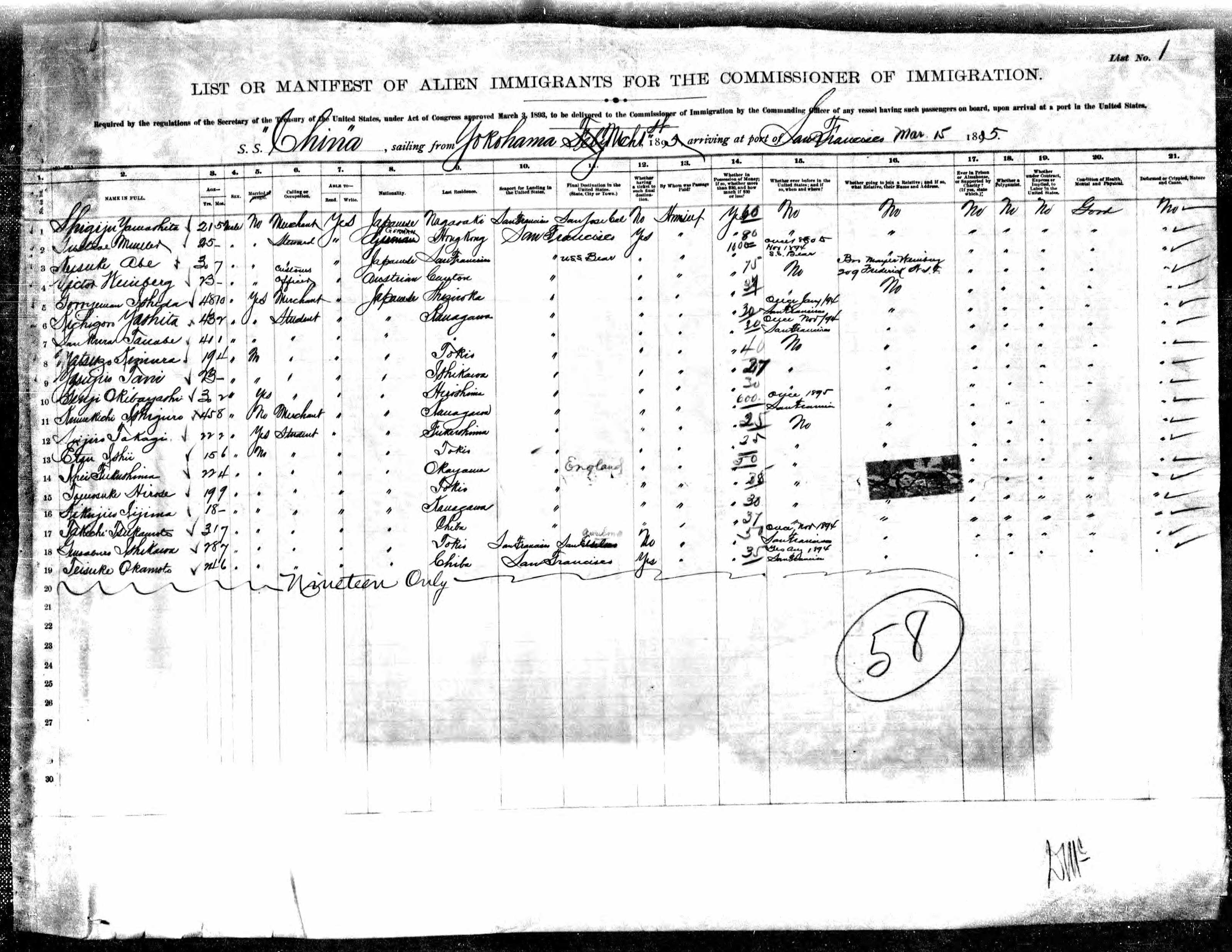| Historical | His name appears on a ship’s manifest for the SS China, which sailed from Hong Kong on 9 August and Yokohama on 19 August 1893, and arrived in San Francisco on 31 August 1893. He was accompanied on the trip by his parents and sister. |