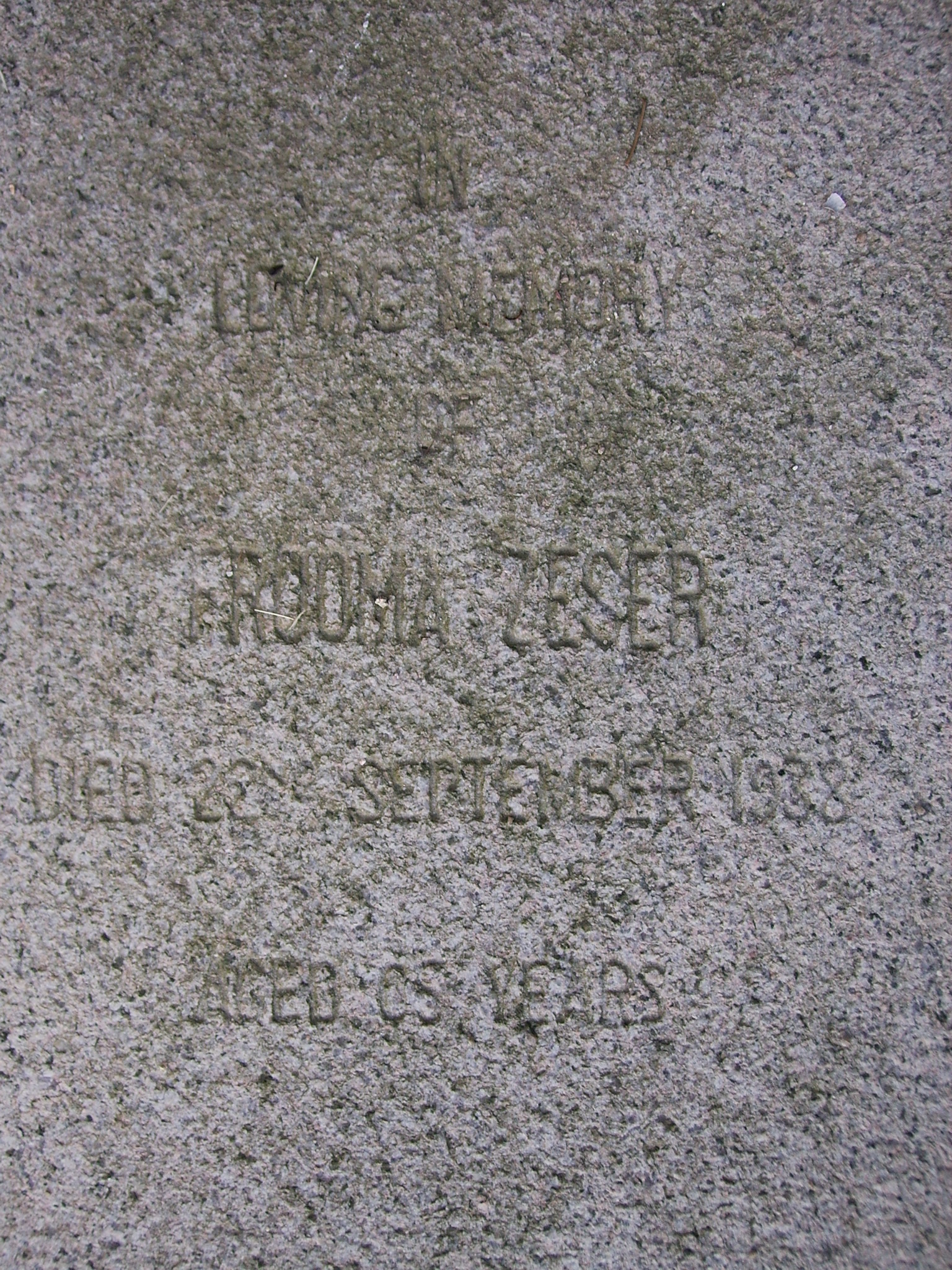 | Inscription (Eng) | IN LOVING MEMORY OF FROOMA ZESER DIED 22ND SEPTEMBER 1938 AGED 65 YEARS |