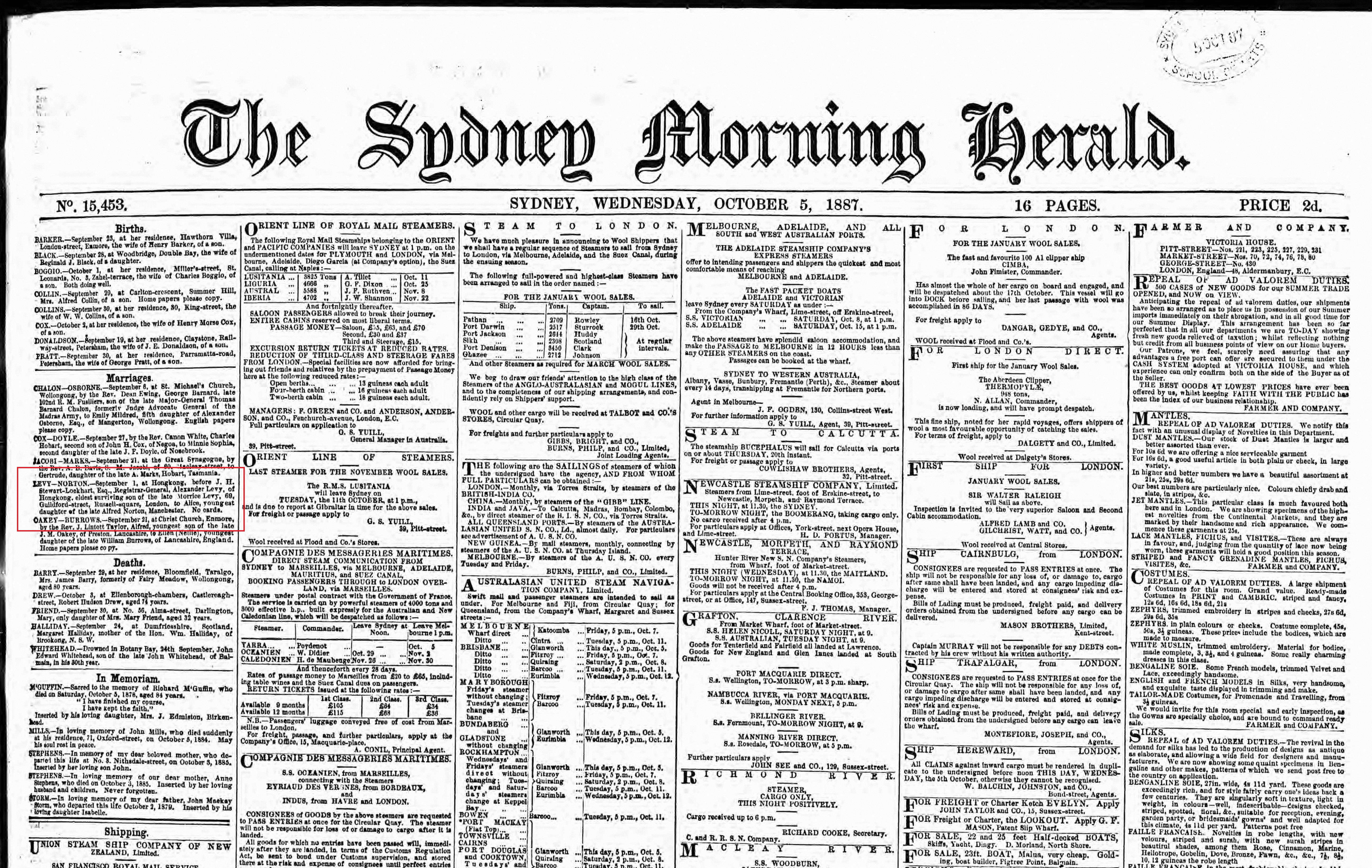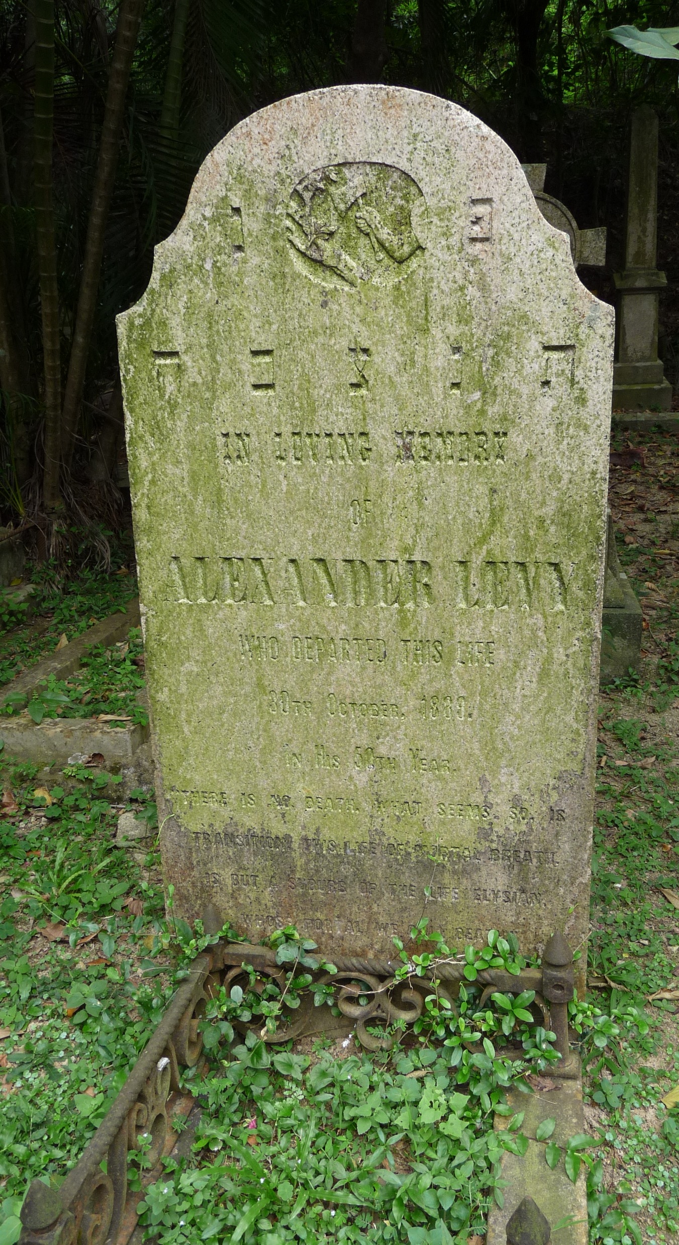 | Historical | Alexander arrived in HK in 1859 to work for the brokering firm, C. C. Cohen & Co., located on D’Aguilar Street. At that time, he lived with the firm’s founder, Charles Coleman Cohen. In 1871, he joined Landstein & Co, which was owned by William Rudolph Landstein (1G5). Following Landstein’s death in 1881, he became the company’s manager but in 1883 he joined George R. Stevens Co. The following year he operated under his own name. In 1886, he was appointed the agent for Hong Kong of the South British Insurance Company (now part of the Aviva Group) but on July 24, 1889, a new agent was appointed. It is unclear whether he left the company at that point or if he was too ill to continue working as he died just a few months later. On June 11, 1863, in Shanghai, he joined the Northern Lodge of China, associated with the United Grand Lodge of England, where he remained a member until 1867, when he transferred to the Perseverance Lodge of Hong Kong. This lodge included other Jewish members, such as Charles Coleman Cohen, Raphael Aaron Belilios and Henry Ash Cohen. In 1869, he was summoned to court on the charge of assaulting Charles Cohen’s boy (servant). The boy had answered back when Alexander Levy told him to clean the verandah, saying “suppose you no like my, more better you catchee another boy”. Levy gave him four blows to the face for this impertinence, which the magistrate thought quite reasonable, fining him only 25 cents. His father was a sheriff’s officer (similar to a bailiff, it was the family business), a wine merchant and part-owner of the Drury Lane Theatre. He had eight children (including Alexander) with his first wife, Hannah Alexander, and another eight children with his second wife, also named Hannah, and whom he married 15 months after the death of the first Hannah. Morrice’s father, William Levy, founded the family fortune through keeping a brothel in London, which was further increased through the business of sheriff’s officer and associated money lending. In addition to his two brothers who also went to China, he had another brother who was a magician, ran postal bodybuilding courses, and promoted home electroplating powder. His nephews included a pioneer of Canadian broadcasting, an artist who wrote an anthropological study of Samoa, and a member of the British Special Forces in WWII. He married Alice, a Protestant from Manchester, on September 1, 1887, in a church in Hong Kong. They lived at Parsee Villa on Mosque Junction, off Robinson Road. |