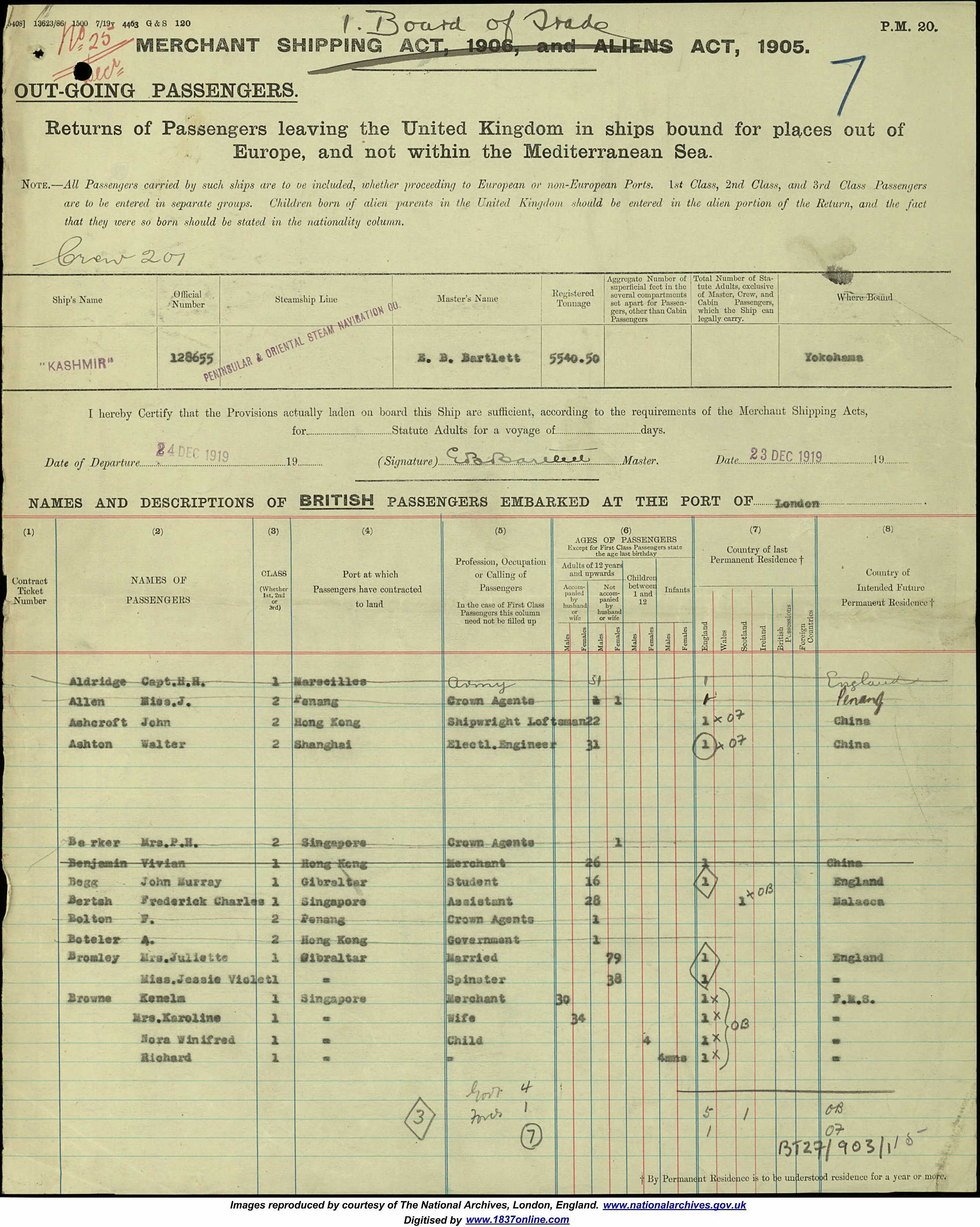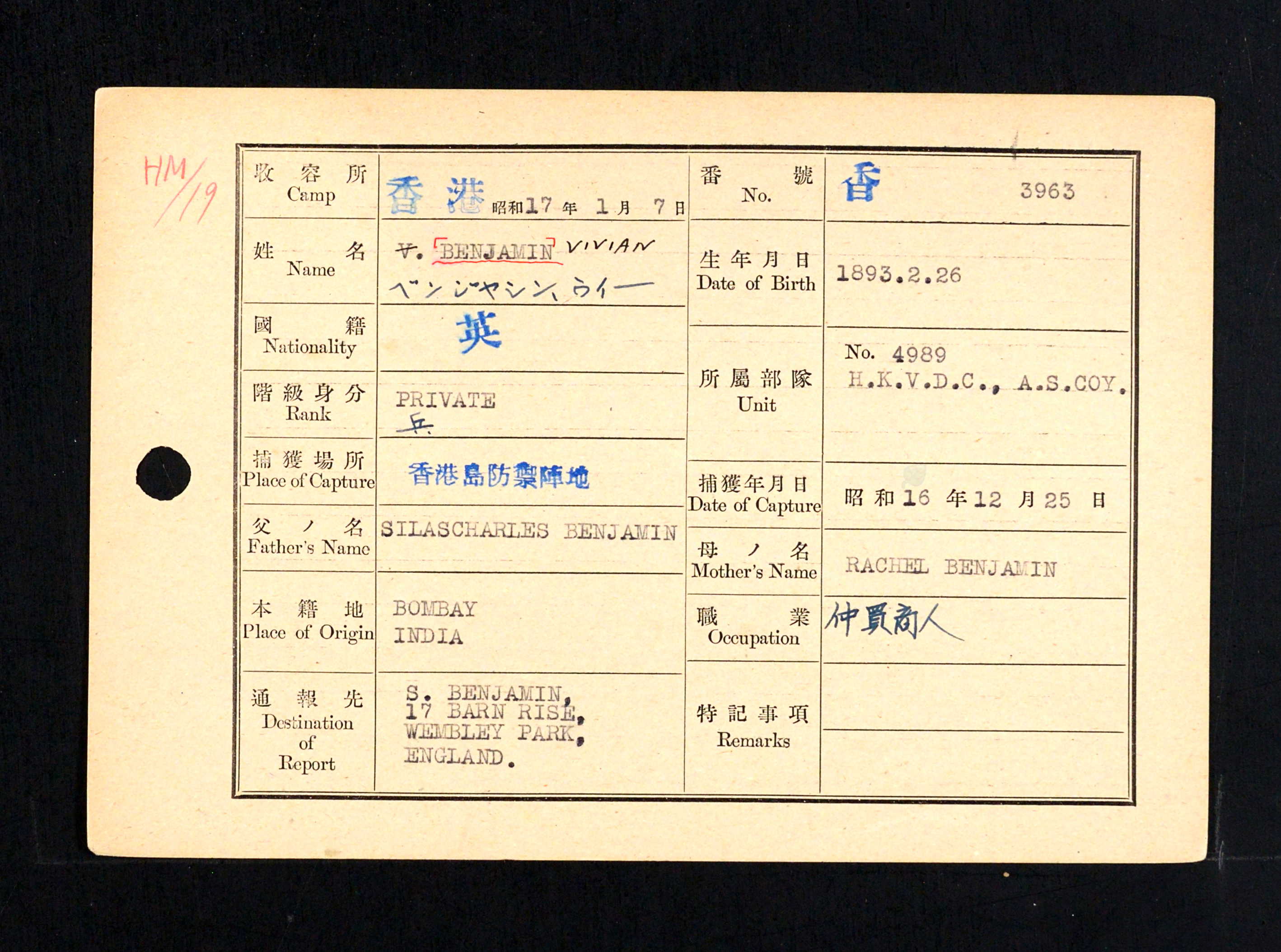 | Historical | He came to Hong Kong from London in 1919. The 1923 jurors’ list has him as a manager at J. R. Michael & Co., a firm of agents, brokers and merchants located in the Hongkong Hotel. He died at sea aboard the HMHS Oxfordshire, a hospital ship that left Hong Kong for the UK on 31 August 1945 with 190 patients aboard, mostly from prisoner of war camps. Hong Kong Volunteer Defence Corps, service number 4989. His parents lived in Wembley Park, London. |