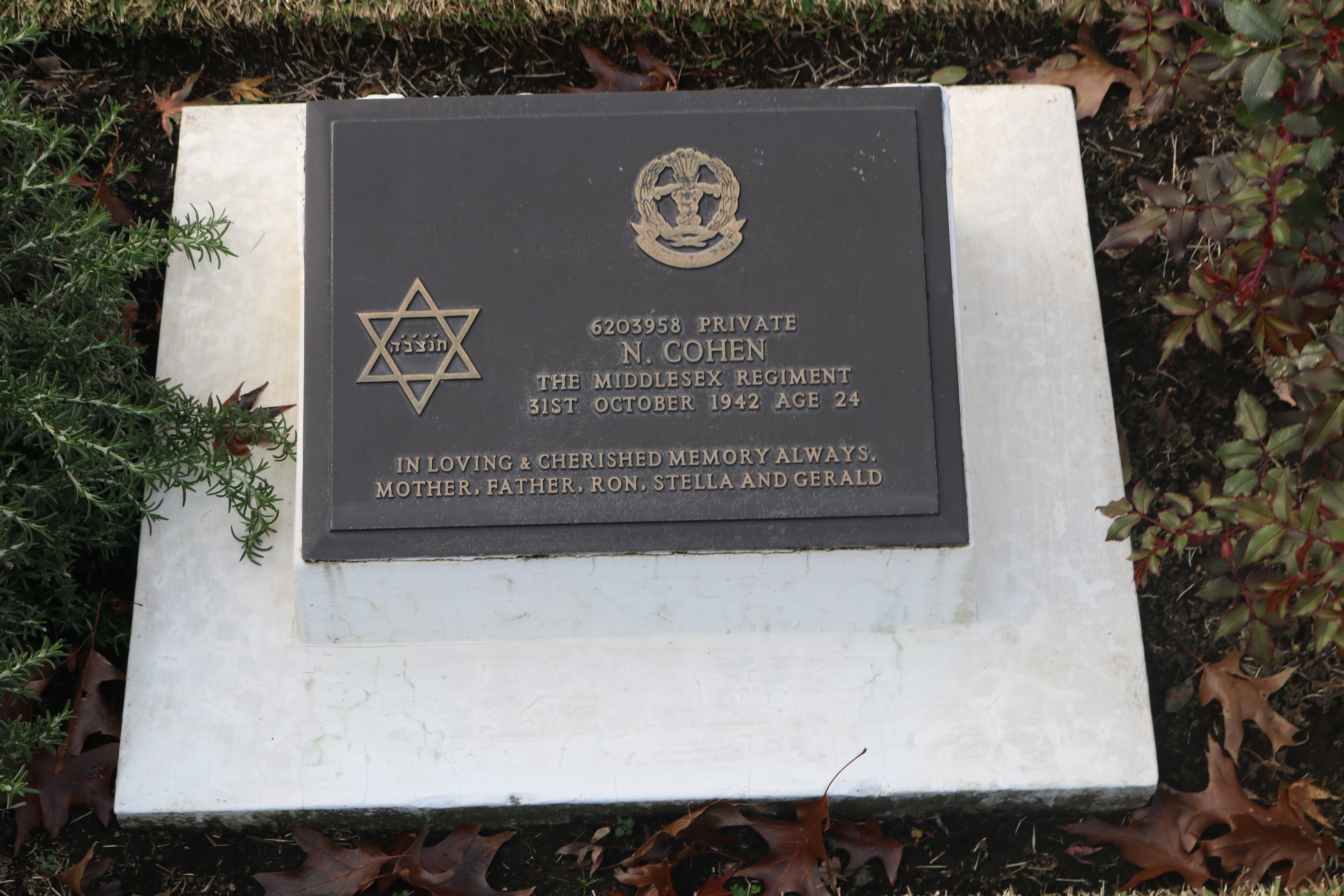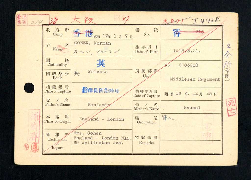 | Historical | Middlesex Regiment, 1st Battalion, service number 6203958. He fought in the battle for Hong Kong, and was captured by the Japanese when the British surrendered on December 25, 1941. After a stay in the Shamshuipo prisoner of war camp, he was put on the Japanese ship Lisbon Maru on September 25, 1942, for transportation to the slave camps in Japan, together with some 1,800 other prisoners of war and about 800 Japanese troops. The ship set sail two days later but on October 1 it was hit by a torpedo from an American submarine, about 200 km southeast of Shanghai. As the ship began to sink, the Japanese troops were taken off but the POWs were left battened down in the holds. They stayed there for 26 hours before managing to break out. Japanese troops initially shot at the men in the water but eventually started picking them up, as did some local Chinese villagers. 825 POWs drowned, but Norman Cohen was one of the survivors, and he was taken to Shanghai. From there he was shipped to Japan on the Washington Maru to Moji. A train then took him to Kobe, where he was placed in a POW camp. He died a few days later. Parents lived at 69 Wellington Avenue, London N15. |