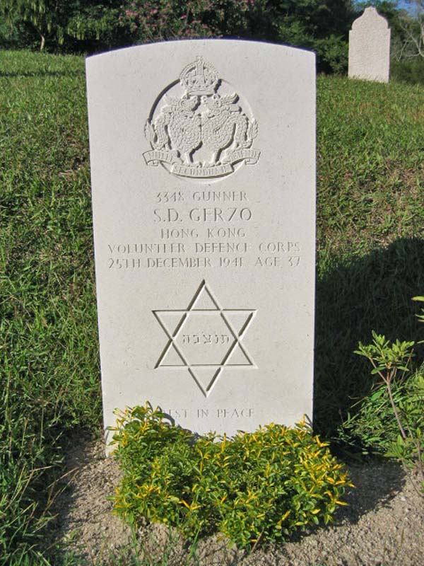 | Inscription (Eng) | (Insignia of the Royal Hong Kong Regiment (The Volunteers)) 3348 GUNNER S.D. GERZO HONG KONG VOLUNTEER DEFENCE CORPS 25TH DECEMBER 1941 AGE 37 (magen david) REST IN PEACE | |