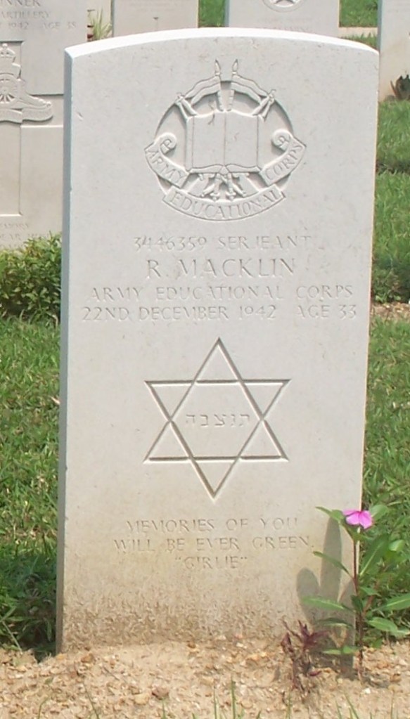 | Inscription (Eng) | (Insignia of the Army Educational Corps) 3446359 SERJEANT R. MACKLIN ARMY EDUCATIONAL CORPS 22ND DECEMBER 1942 AGE 33 (Magen David with Hebrew inscription inside) MEMORIES OF YOU WILL BE EVER GREEN “GIRLIE” |