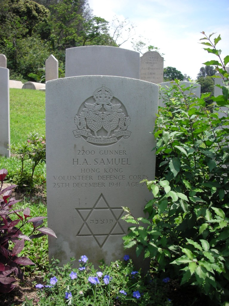 | Inscription (Eng) | (Insignia of The Royal Hong Kong Regiment (The Volunteers)) 2200 GUNNER H.A. SAMUEL HONG KONG VOLUNTEER DEFENCE CORPS 25TH DECEMBER 1941 AGE 29 (Jewish star with Hebrew inscription inside) |