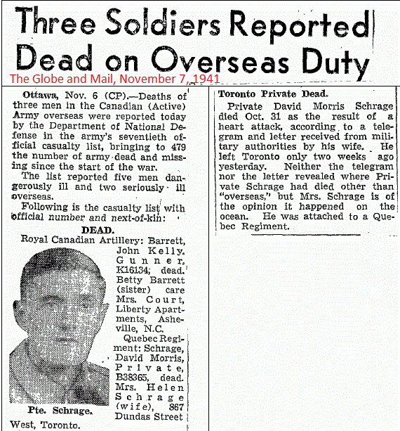 | Historical | Royal Rifles of Canada, R.C.I.C., service number B/38365. David was a diabetic but he didn’t want anyone in his unit to know for fear that he would be deemed unfit to serve so he apparently stopped taking his insulin. While en route to Hong Kong, he developed medical complications that led to his having a heart attack and dying. He was buried at sea. He immigrated to Canada in 1930. He had a half-sister in Winnipeg. His parents, or perhaps his mother and step-father, must have arrived after him. In 1930, he was living on Flora Avenue in Winnipeg. Presumably, this was his parents’ house. He was employed as a miller at the time. Helen died on July 19, 1983, and is buried in Toronto. It appears that she never remarried. |