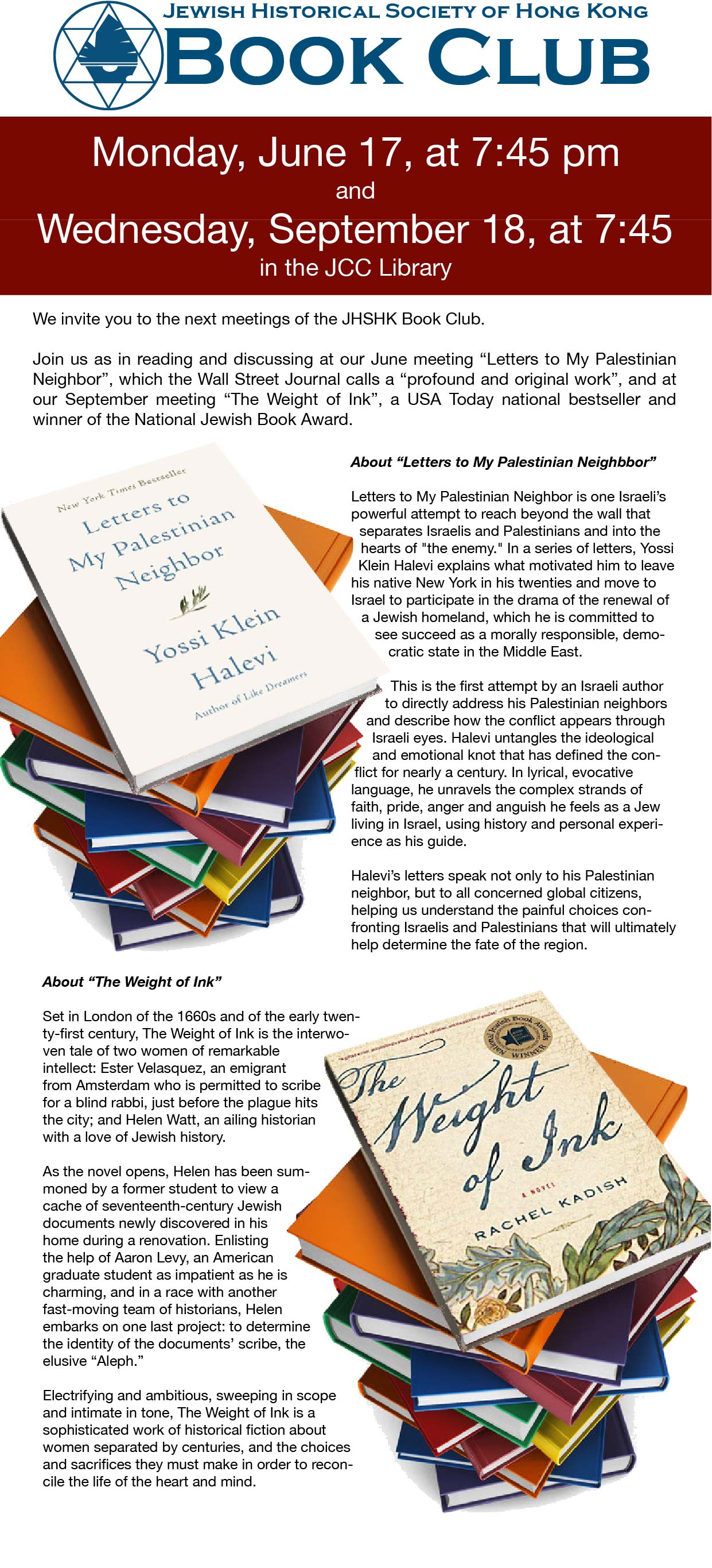 At our September meeting we will be discussing “The Weight of Ink”, a USA Today bestseller and winner of the National Jewish Book Award.